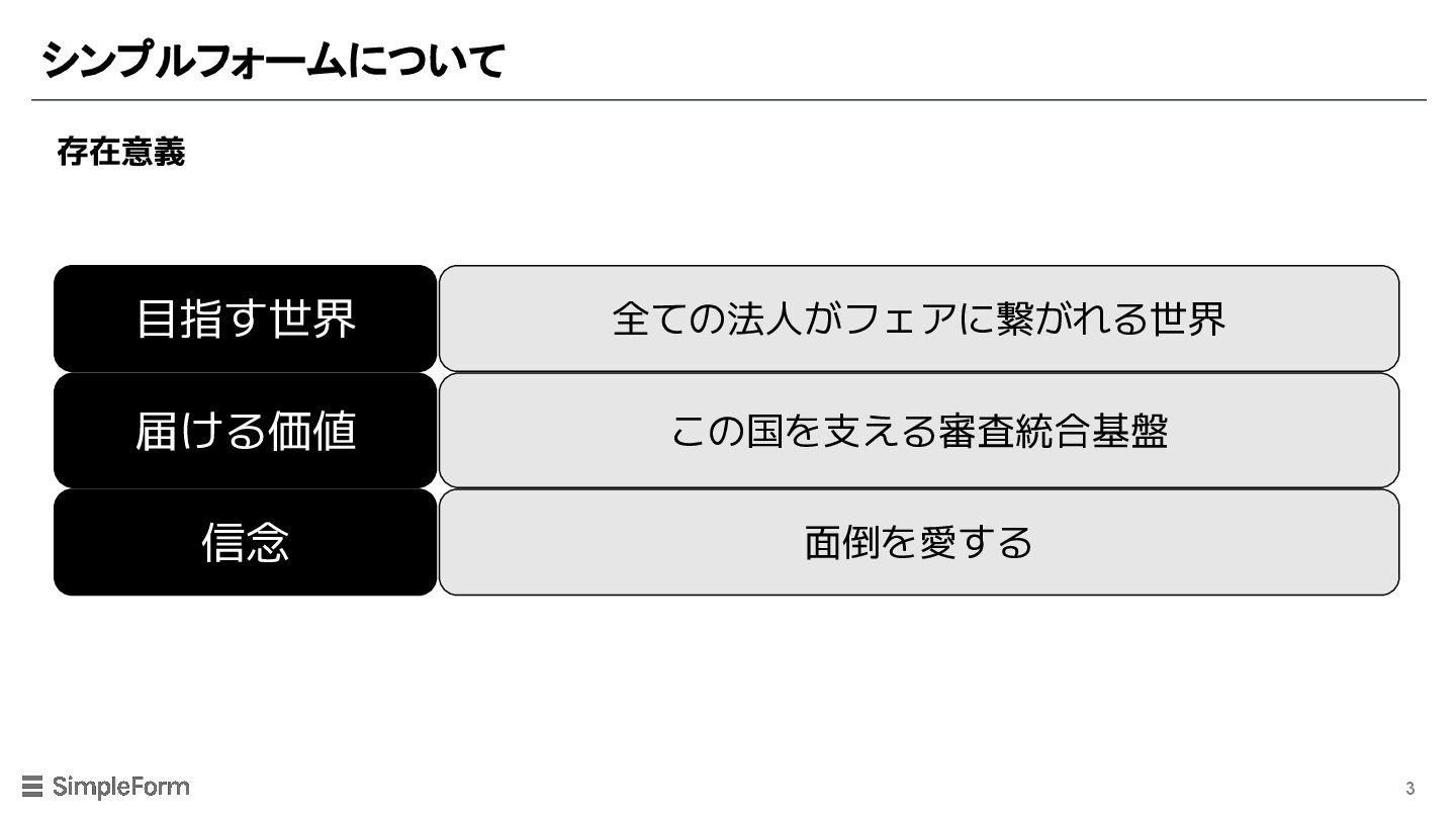 3 シンプルフォームについて 目指す世界 全ての法人がフェアに繋がれる世界 届ける価値 この国を支える審査統合基盤 信念 面倒を愛する 存在意義