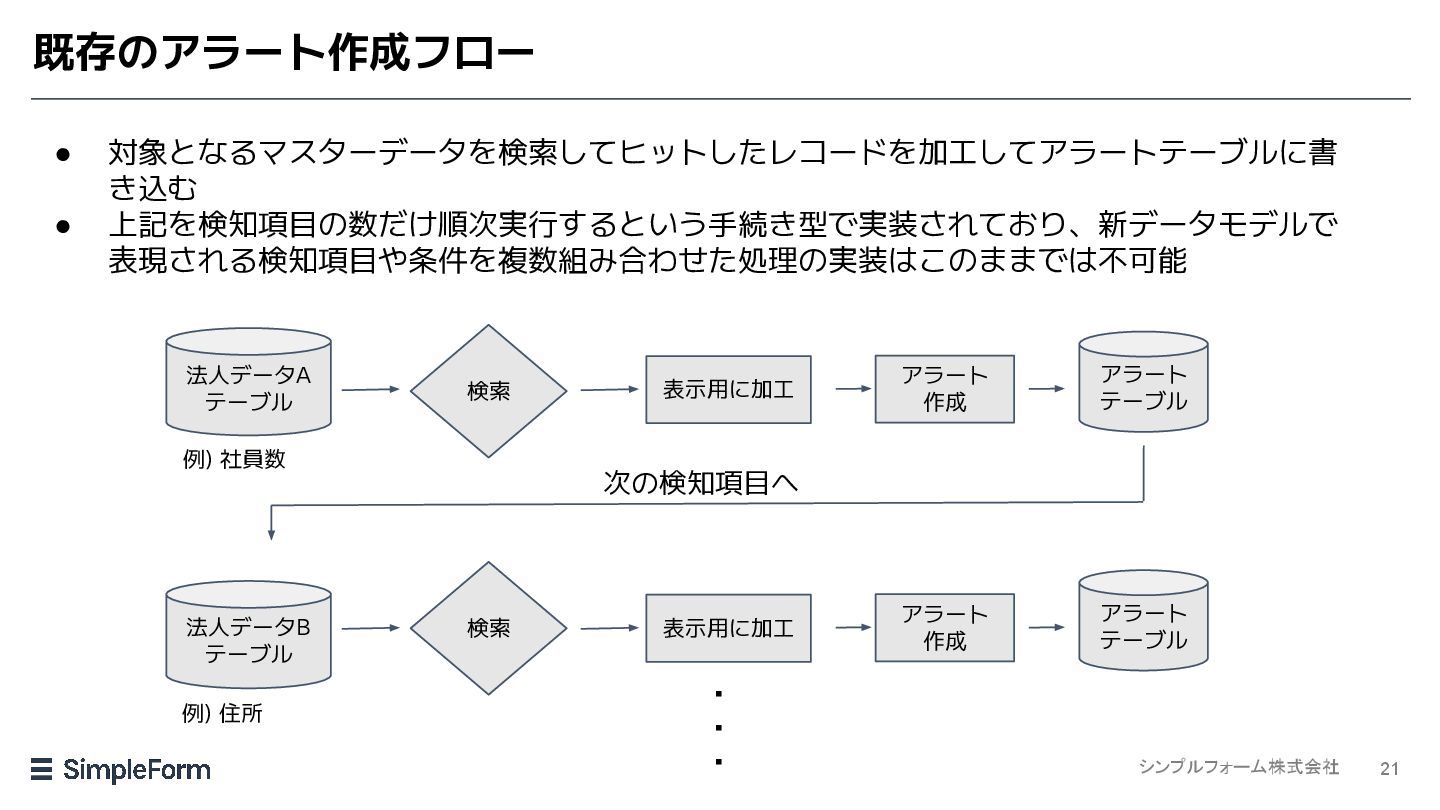シンプルフォーム株式会社 新データモデルの課題 20 • 「シナリオ」という概念が誕生し、アラートを上げる条件や検知項目がユーザー毎に可変に なった • 条件 x 検知項目の組み合わせが掛け算で増えていくことになり、ロジックをどう実装するか