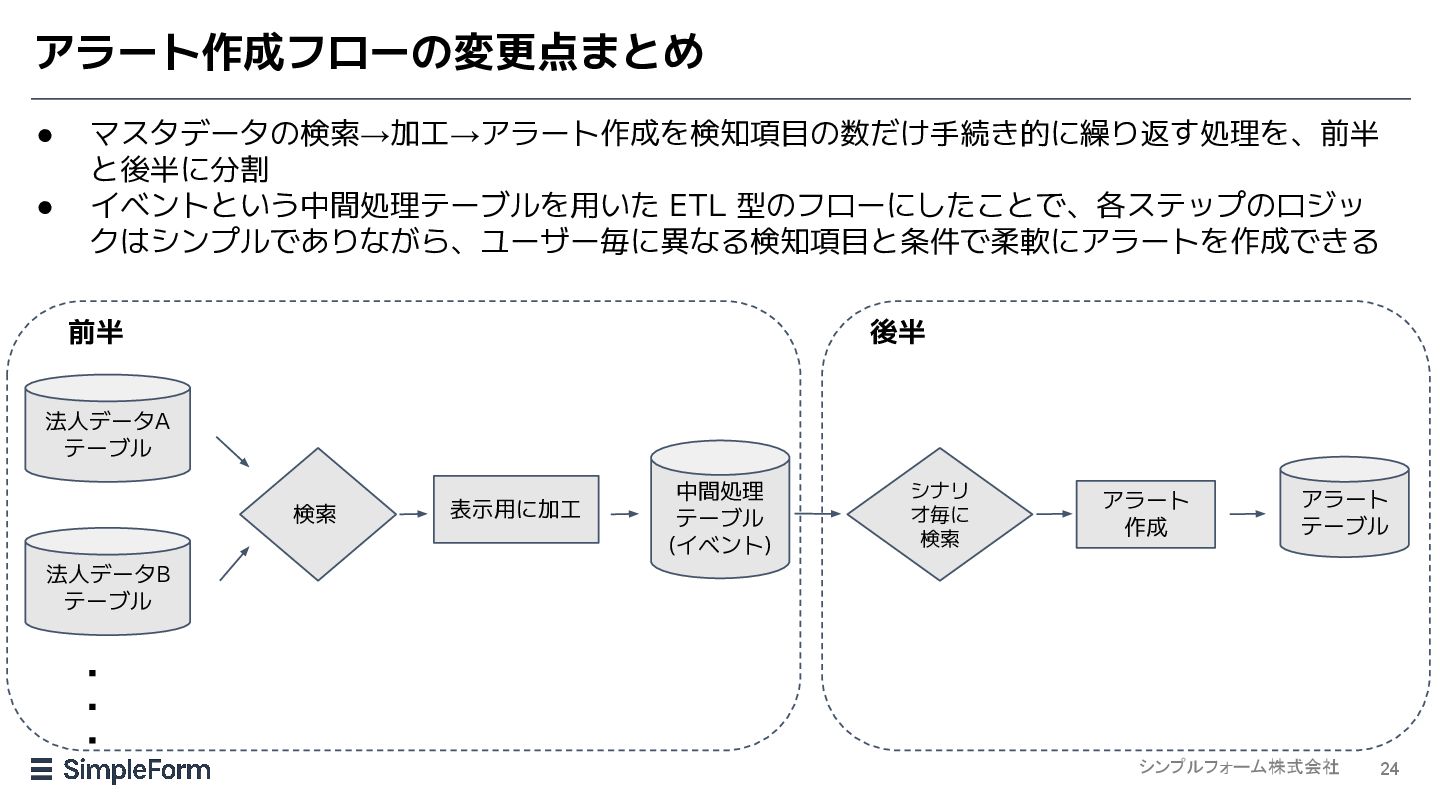 シナリ オ毎に 検索 アラート 作成 アラート テーブル 23 中間処理 テーブル (イベント) (例) 「社員数が50人以下かつ住所が1回変更」 を検知したいシナリオの場合、 同じ法人に対して右記のような2レコード がヒットしたらアラートを作成 id corporate_id category_id value 1 333 4 (社員数変化) 50 2 333 5 (住所変更) null イベントレコード
