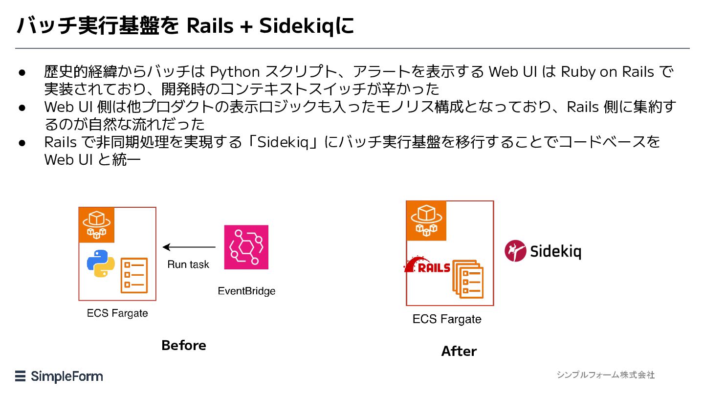 UI は Ruby on Rails で 実装されており、開発時のコンテキストスイッチが辛かった • Web UI 側は他プロダクトの表示ロジックも入ったモノリス構成となっており、Rails 側に集約す るのが自然な流れだった • Rails で非同期処理を実現する「Sidekiq」にバッチ実行基盤を移行することでコードベースを Web UI と統一 Before After