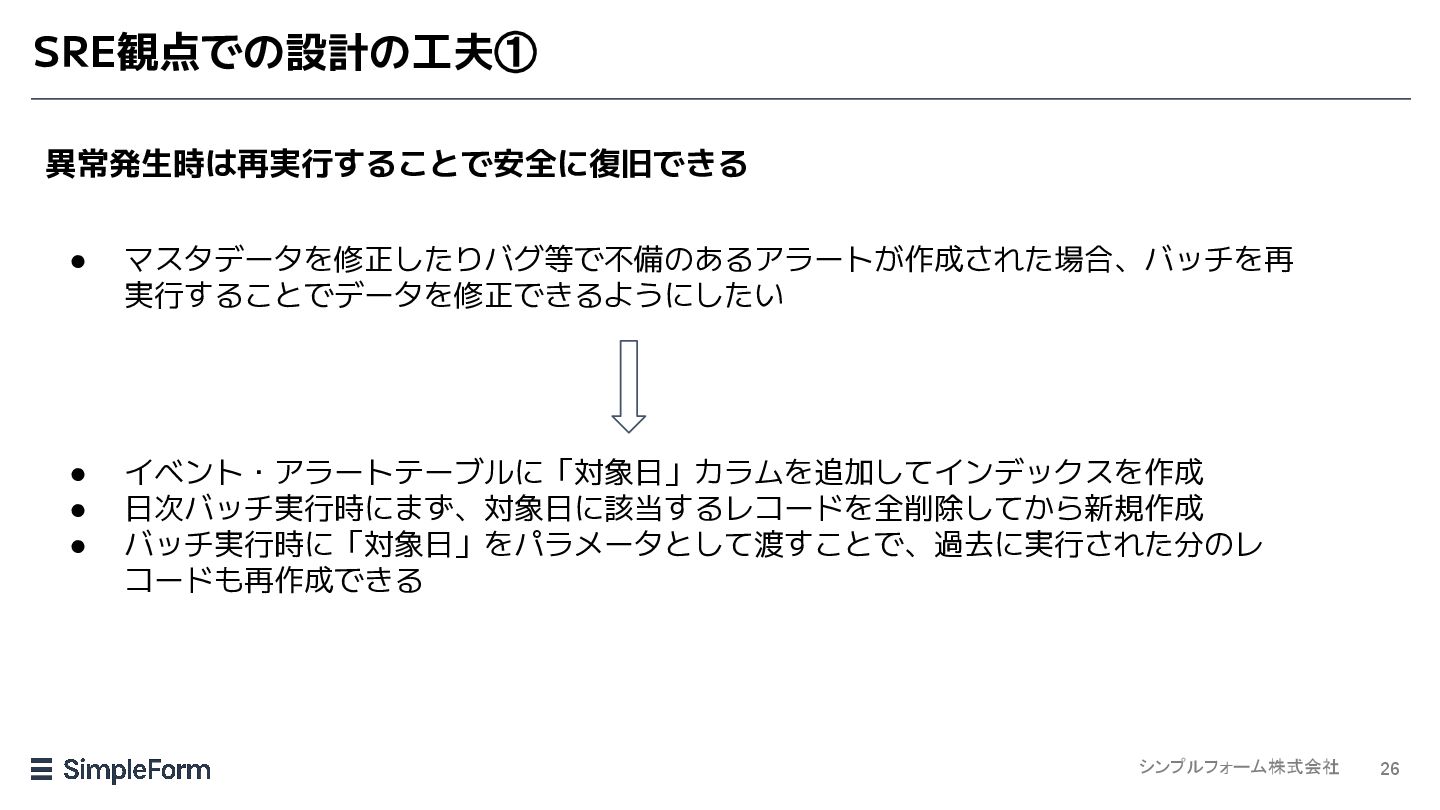シンプルフォーム株式会社 SRE観点での設計の工夫① 26 • マスタデータを修正したりバグ等で不備のあるアラートが作成された場合、バッチを再 実行することでデータを修正できるようにしたい 異常発生時は再実行することで安全に復旧できる • イベント・アラートテーブルに「対象日」カラムを追加してインデックスを作成 •