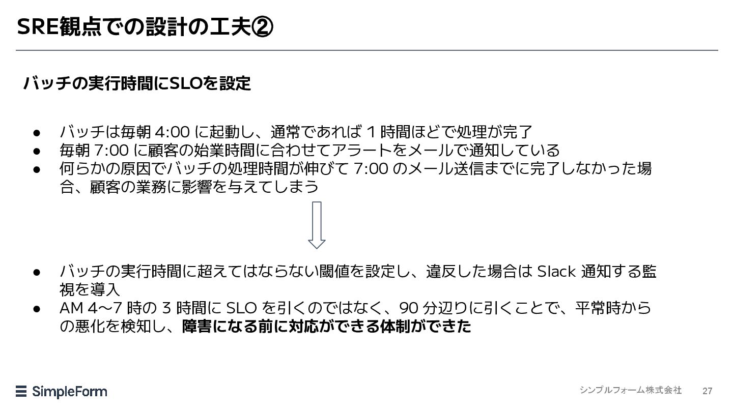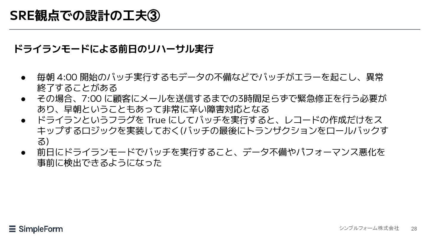 シンプルフォーム株式会社 SRE観点での設計の工夫② 27 • バッチは毎朝 4:00 に起動し、通常であれば 1 時間ほどで処理が完了 •