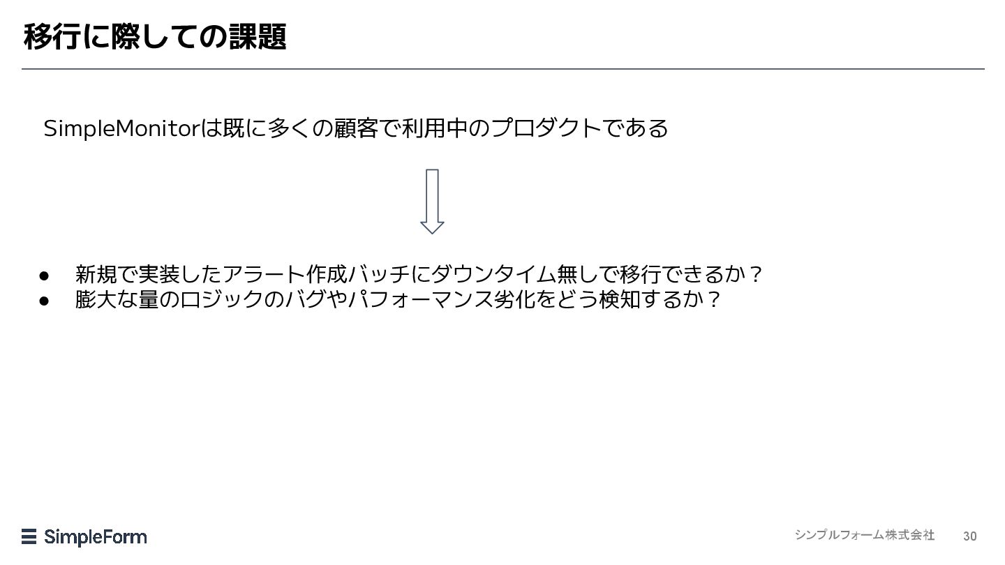 シンプルフォーム株式会社 移行に際しての課題 30 SimpleMonitorは既に多くの顧客で利用中のプロダクトである • 新規で実装したアラート作成バッチにダウンタイム無しで移行できるか? • 膨大な量のロジックのバグやパフォーマンス劣化をどう検知するか?