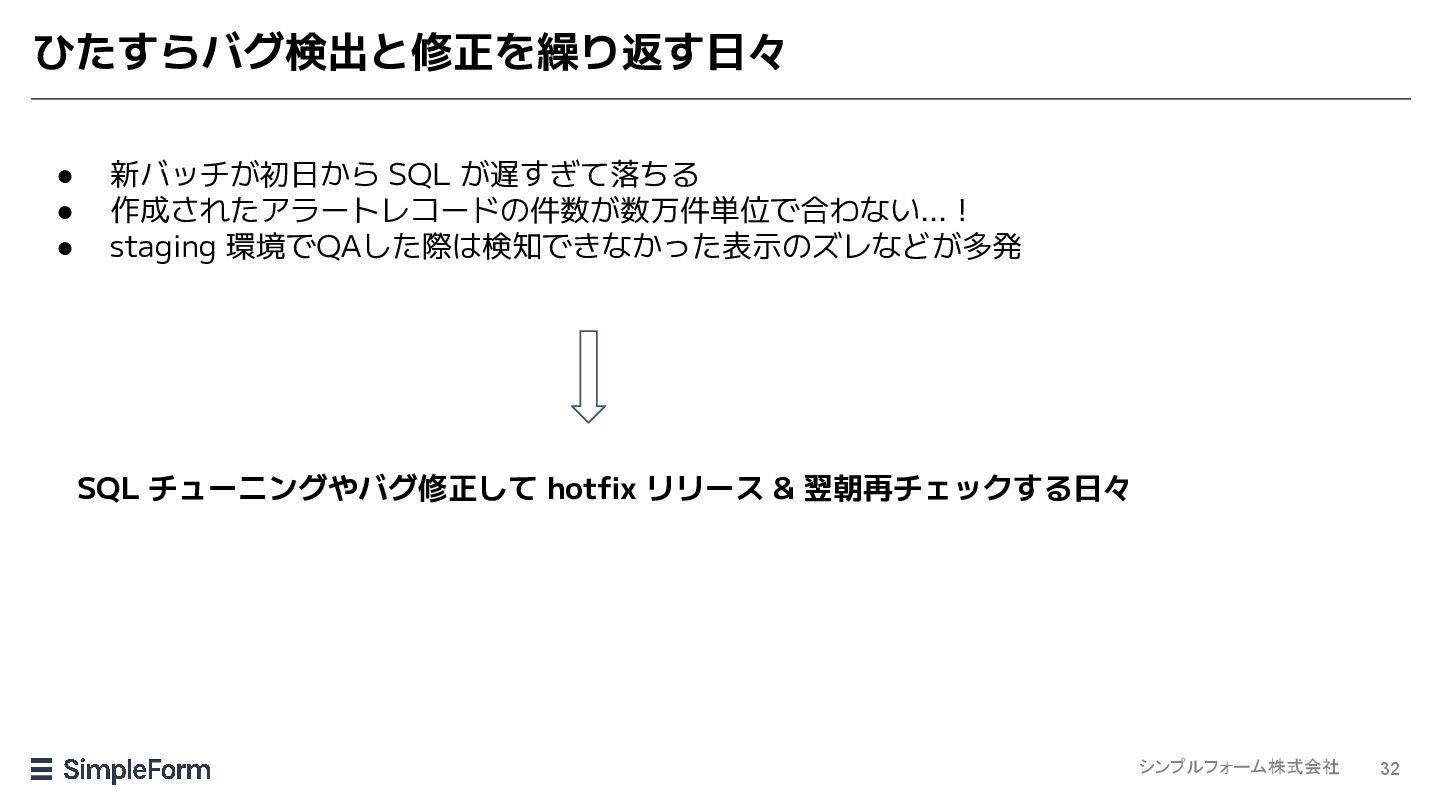 シンプルフォーム株式会社 ひたすらバグ検出と修正を繰り返す日々 32 • 新バッチが初日から SQL が遅すぎて落ちる • 作成されたアラートレコードの件数が数万件単位で合わない...! •