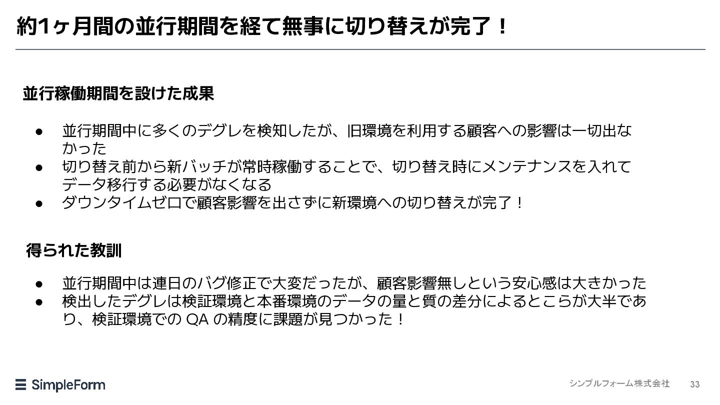 シンプルフォーム株式会社 約1ヶ月間の並行期間を経て無事に切り替えが完了! 33 並行稼働期間を設けた成果 • 並行期間中に多くのデグレを検知したが、旧環境を利用する顧客への影響は一切出な かった • 切り替え前から新バッチが常時稼働することで、切り替え時にメンテナンスを入れて データ移行する必要がなくなる