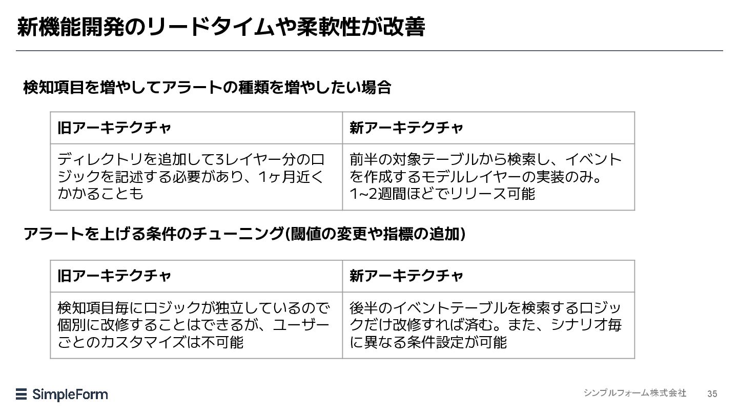 シンプルフォーム株式会社 新機能開発のリードタイムや柔軟性が改善 35 検知項目を増やしてアラートの種類を増やしたい場合 旧アーキテクチャ 新アーキテクチャ ディレクトリを追加して3レイヤー分のロ ジックを記述する必要があり、1ヶ月近く かかることも 前半の対象テーブルから検索し、イベント