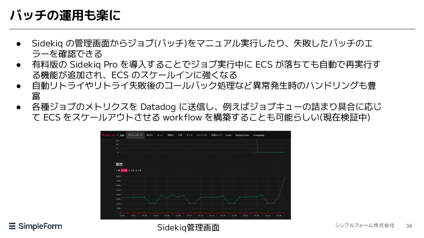 シンプルフォーム株式会社 バッチの運用も楽に 36 • Sidekiq の管理画面からジョブ(バッチ)をマニュアル実行したり、失敗したバッチのエ ラーを確認できる • 有料版の Sidekiq