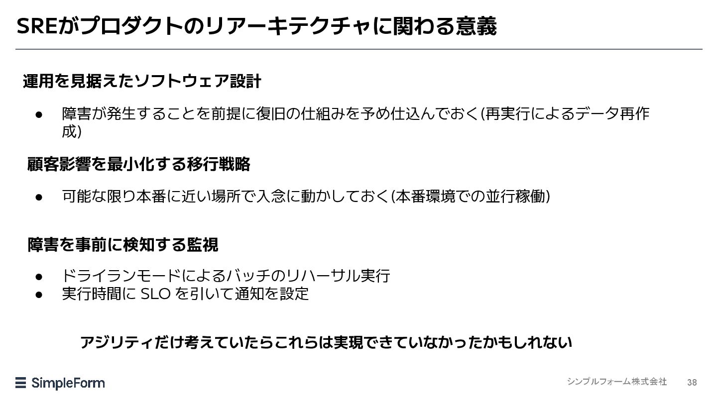 シンプルフォーム株式会社 38 運用を見据えたソフトウェア設計 SREがプロダクトのリアーキテクチャに関わる意義 • 障害が発生することを前提に復旧の仕組みを予め仕込んでおく(再実行によるデータ再作 成) 顧客影響を最小化する移行戦略 • 可能な限り本番に近い場所で入念に動かしておく(本番環境での並行稼働)