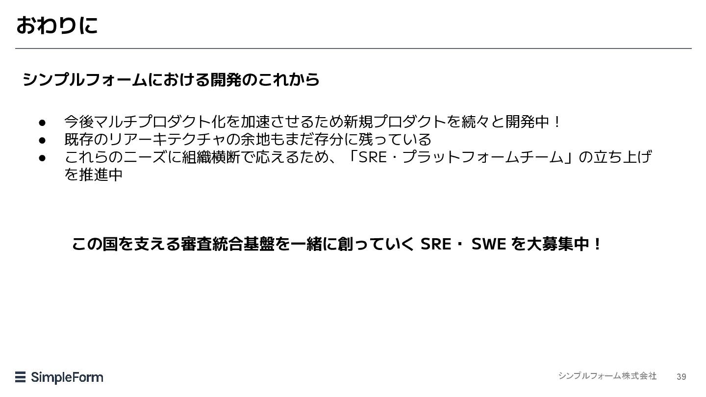 シンプルフォーム株式会社 おわりに 39 この国を支える審査統合基盤を一緒に創っていく SRE・ SWE を大募集中! • 今後マルチプロダクト化を加速させるため新規プロダクトを続々と開発中! •