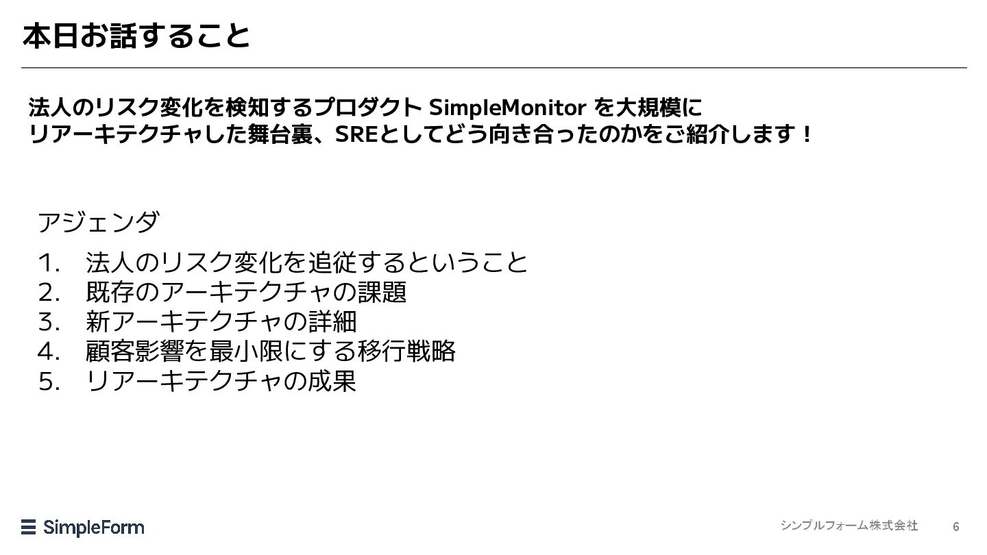 顧客影響を最小限にする移行戦略 5. リアーキテクチャの成果 法人のリスク変化を検知するプロダクト SimpleMonitor を大規模に リアーキテクチャした舞台裏、SREとしてどう向き合ったのかをご紹介します! アジェンダ