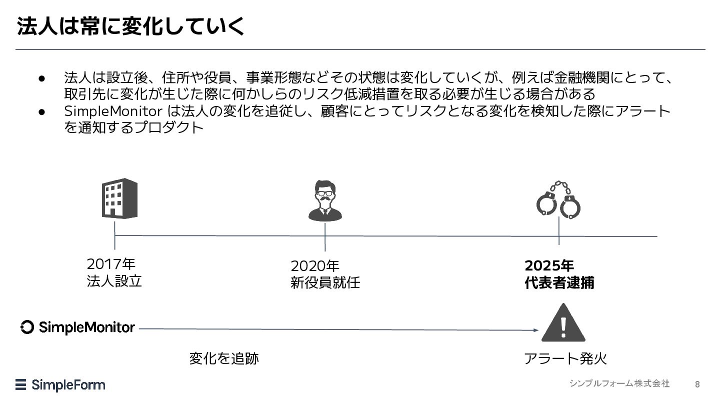 法人は設立後、住所や役員、事業形態などその状態は変化していくが、例えば金融機関にとって、 取引先に変化が生じた際に何かしらのリスク低減措置を取る必要が生じる場合がある • SimpleMonitor は法人の変化を追従し、顧客にとってリスクとなる変化を検知した際にアラート を通知するプロダクト 変化を追跡 アラート発火