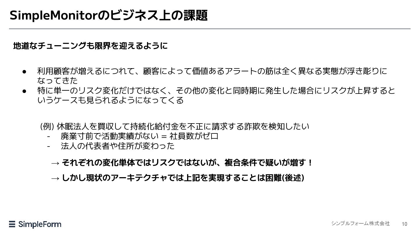 (例) 休眠法人を買収して持続化給付金を不正に請求する詐欺を検知したい - 廃業寸前で活動実績がない = 社員数がゼロ - 法人の代表者や住所が変わった → それぞれの変化単体ではリスクではないが、複合条件で疑いが増す! → しかし現状のアーキテクチャでは上記を実現することは困難(後述)