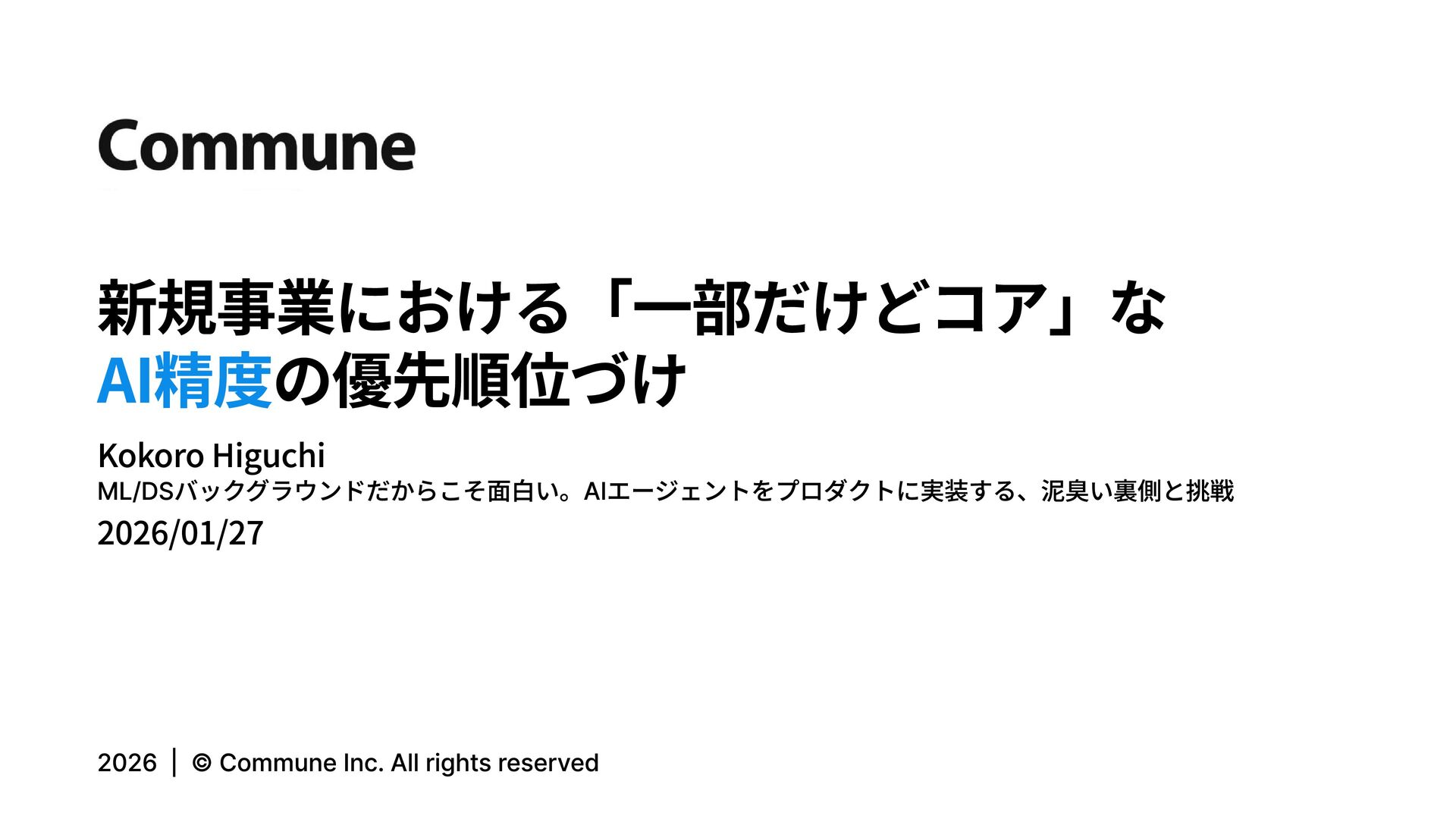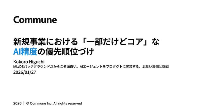 新規事業における「一部だけどコア」な の優先順位づけ AI精度 Kokoro Higuchi ML/DSバックグラウンドだからこそ面白い。AIエージェントをプロダクトに実装する、泥臭い裏側と挑戦 2026/01/27 2026 | ©