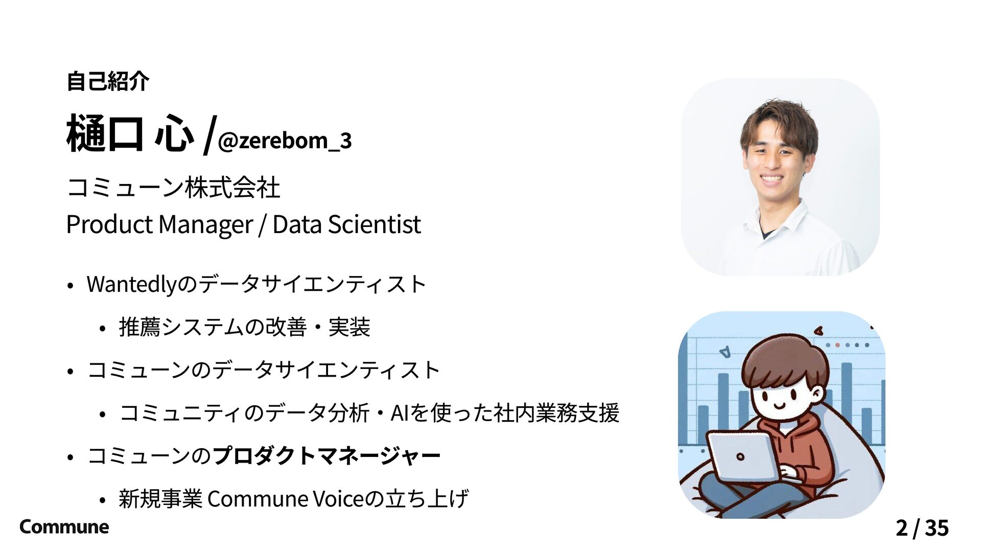 心 /@zerebom_3 コミューン株式会社 Product Manager / Data Scientist 2 / 35