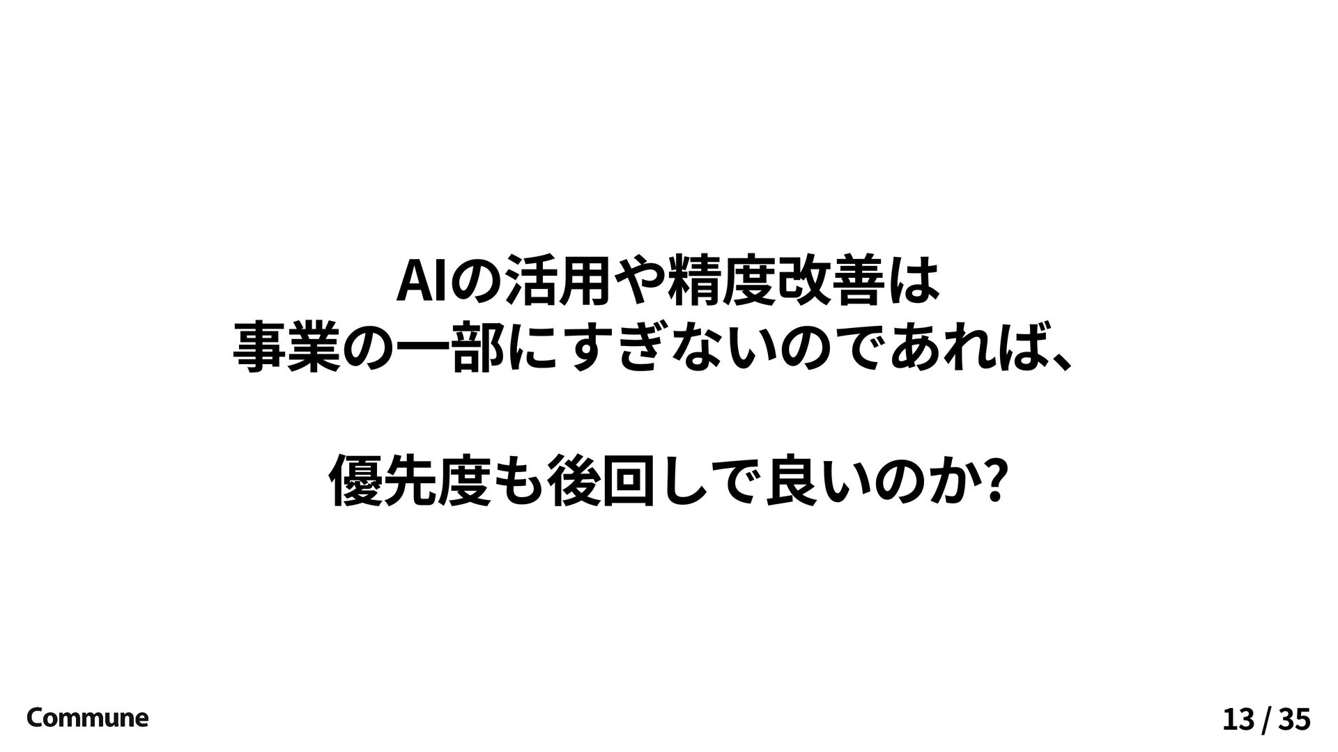 AIの活用や精度改善は 事業の一部にすぎないのであれば、 優先度も後回しで良いのか? 13 / 35