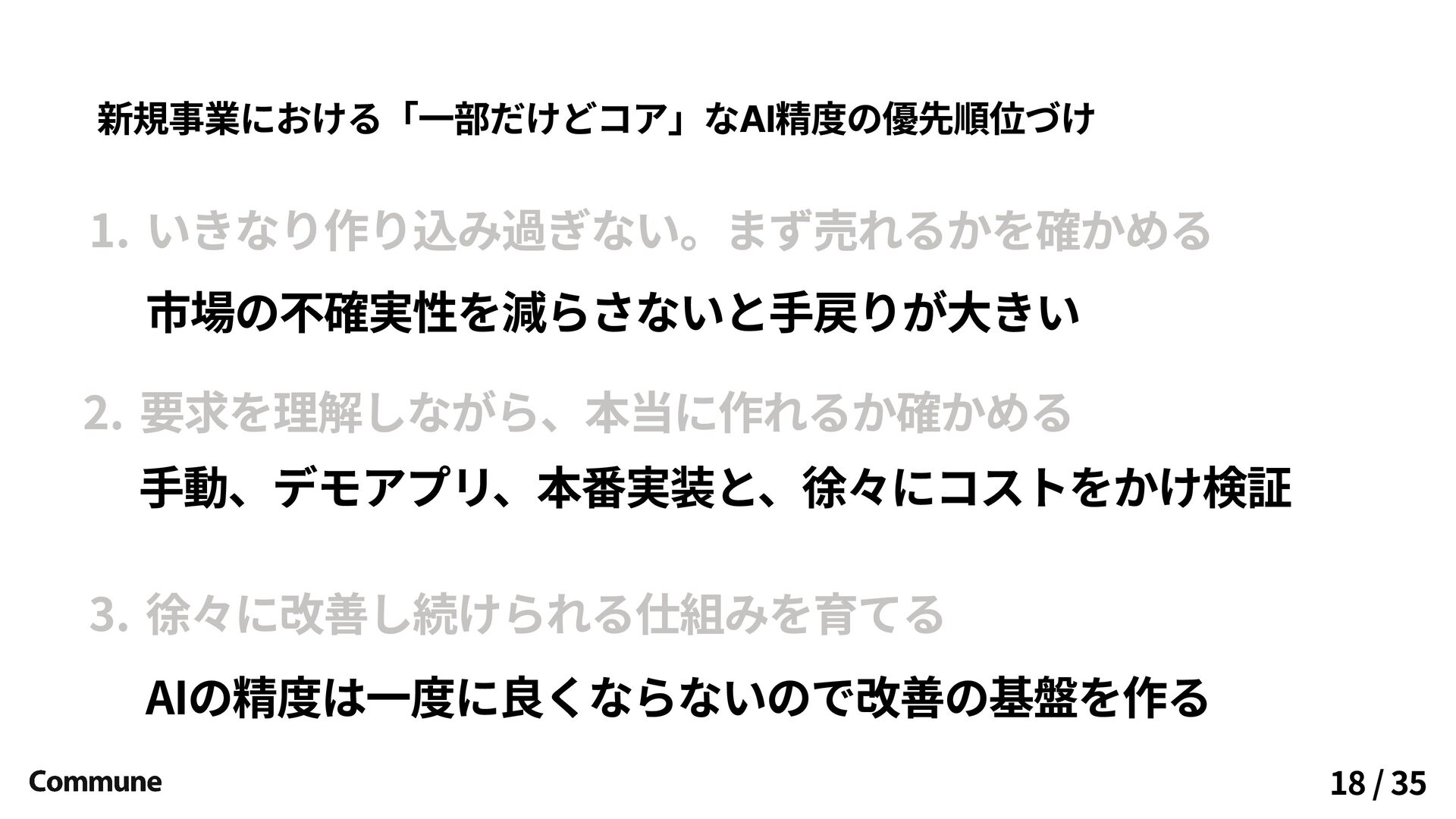 いきなり作り込み過ぎない。まず売れるかを確かめる 市場の不確実性を減らさないと手戻りが大きい 要求を理解しながら、本当に作れるか確かめる 徐々に改善し続けられる仕組みを育てる AIの精度は一度に良くならないので改善の基盤を作る 手動、デモアプリ、本番実装と、徐々にコストをかけ検証 新規事業における「一部だけどコア」なAI精度の優先順位づけ 35 / 35