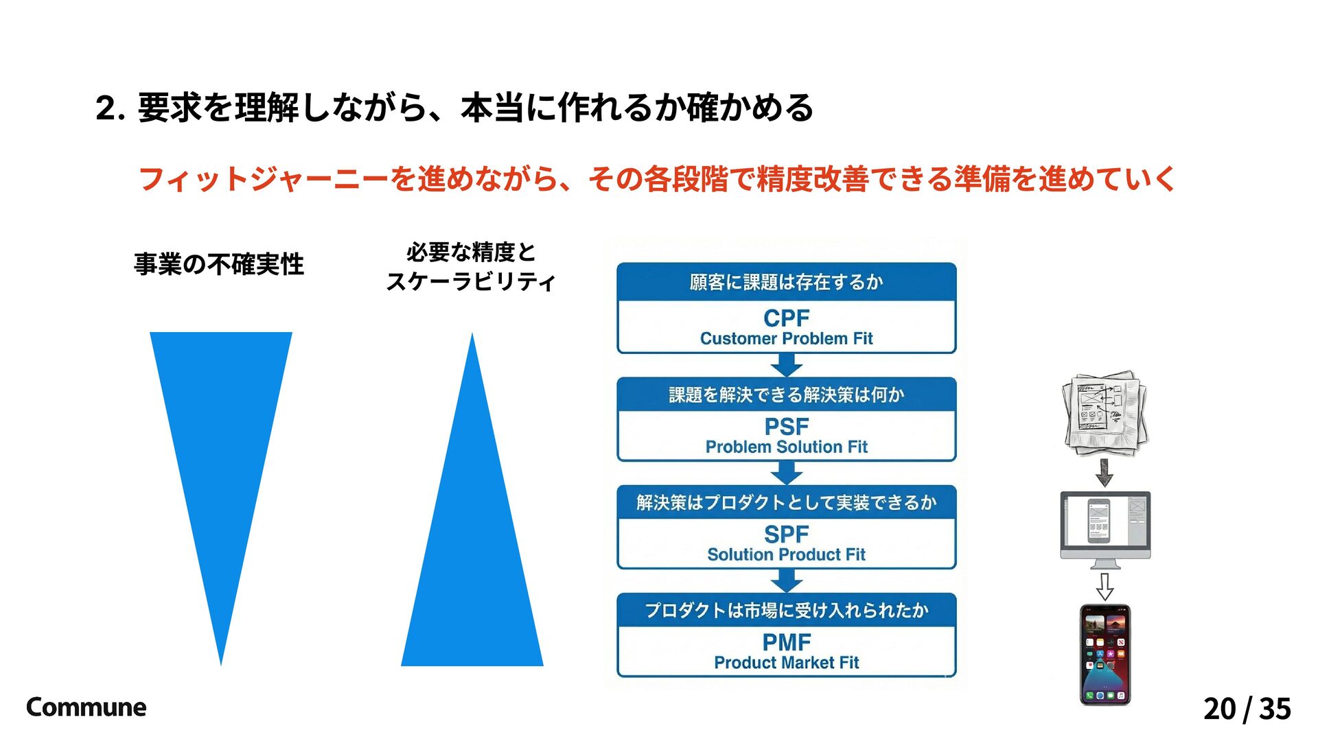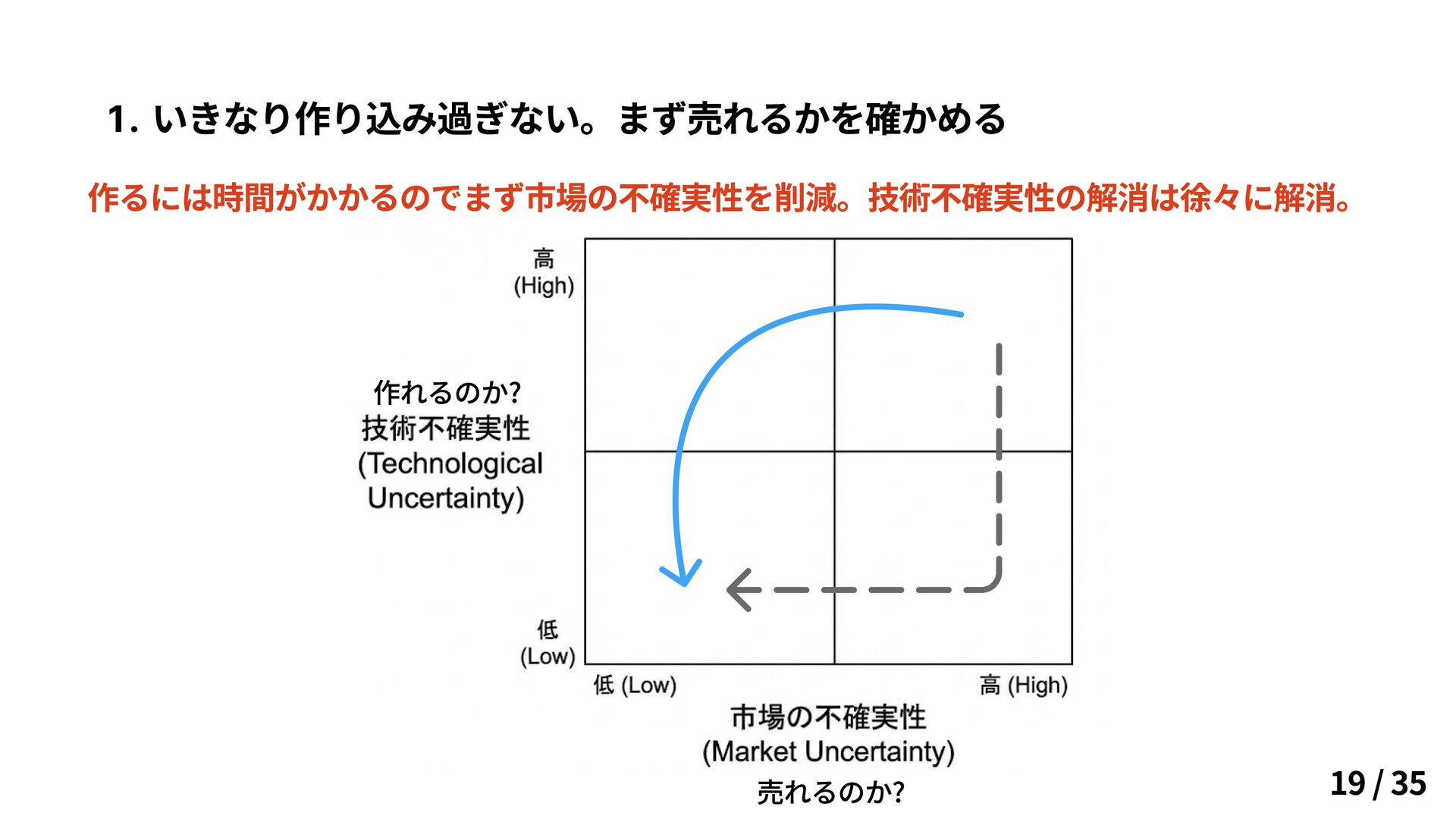 いきなり作り込み過ぎない。まず売れるかを確かめる 作るには時間がかかるのでまず市場の不確実性を削減。技術不確実性の解消は徐々に解消。 19 / 35 売れるのか? 作れるのか?