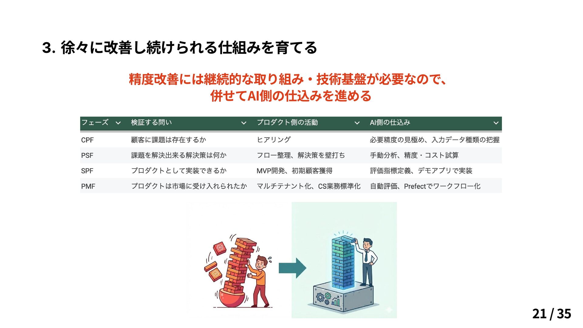 要求を理解しながら、本当に作れるか確かめる フィットジャーニーを進めながら、その各段階で精度改善できる準備を進めていく 必要な精度と スケーラビリティ 事業の不確実性 20 / 35