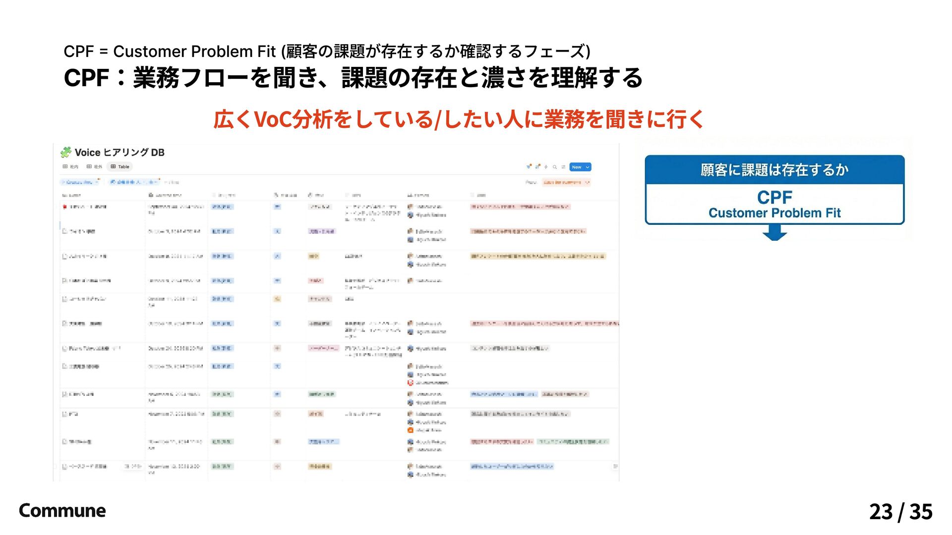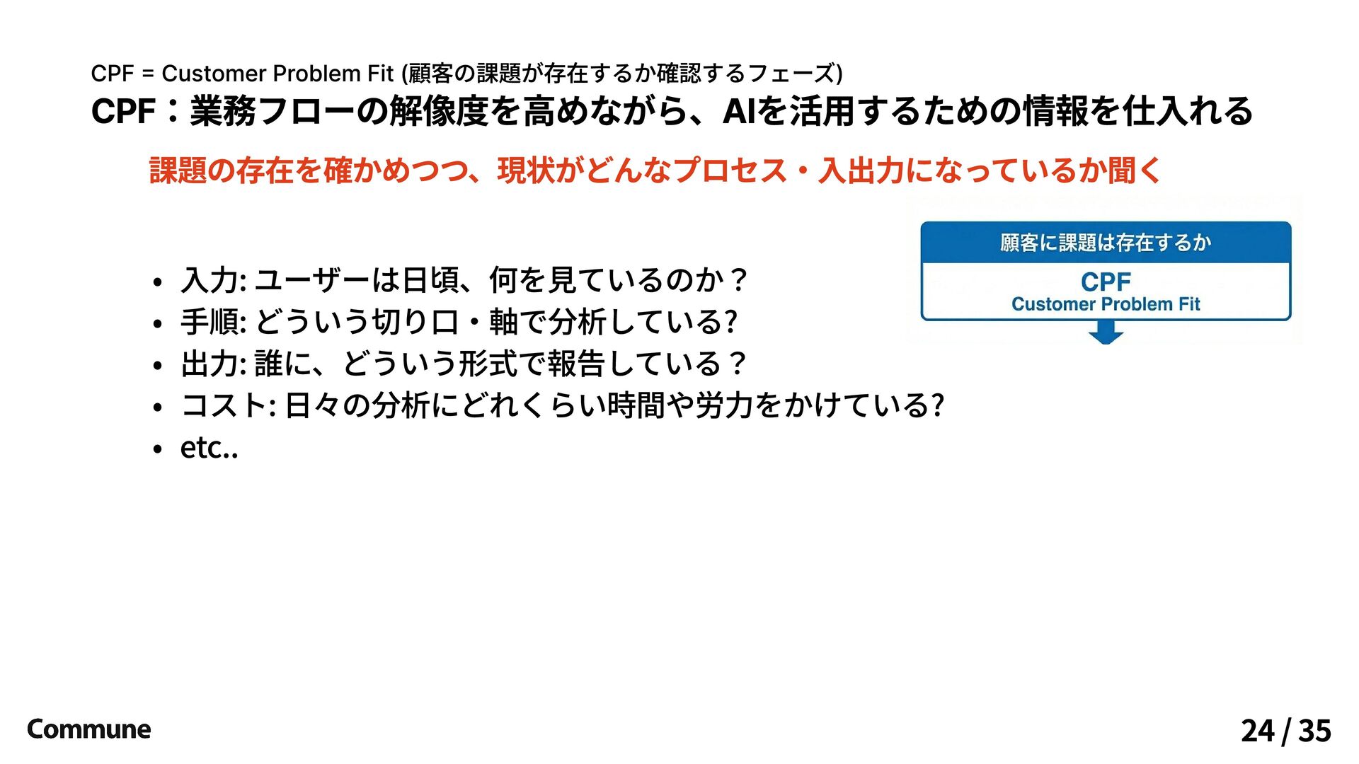 CPF:業務フローを聞き、課題の存在と濃さを理解する 広くVoC分析をしている/したい人に業務を聞きに行く CPF = Customer Problem Fit (顧客の課題が存在するか確認するフェーズ) 23 /