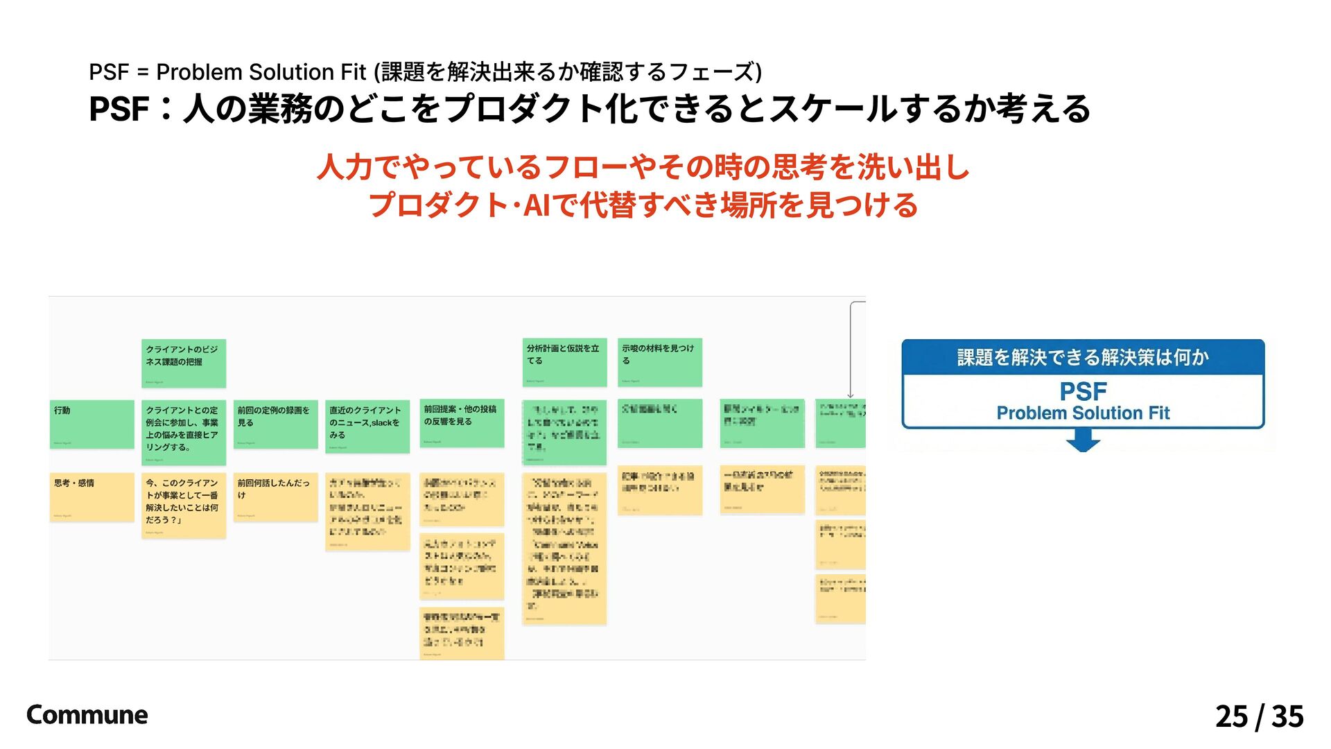 PSF:人の業務のどこをプロダクト化できるとスケールするか考える 人力でやっているフローやその時の思考を洗い出し プロダクト・AIで代替すべき場所を見つける PSF = Problem Solution Fit (課題を解決出来るか確認するフェーズ) 25