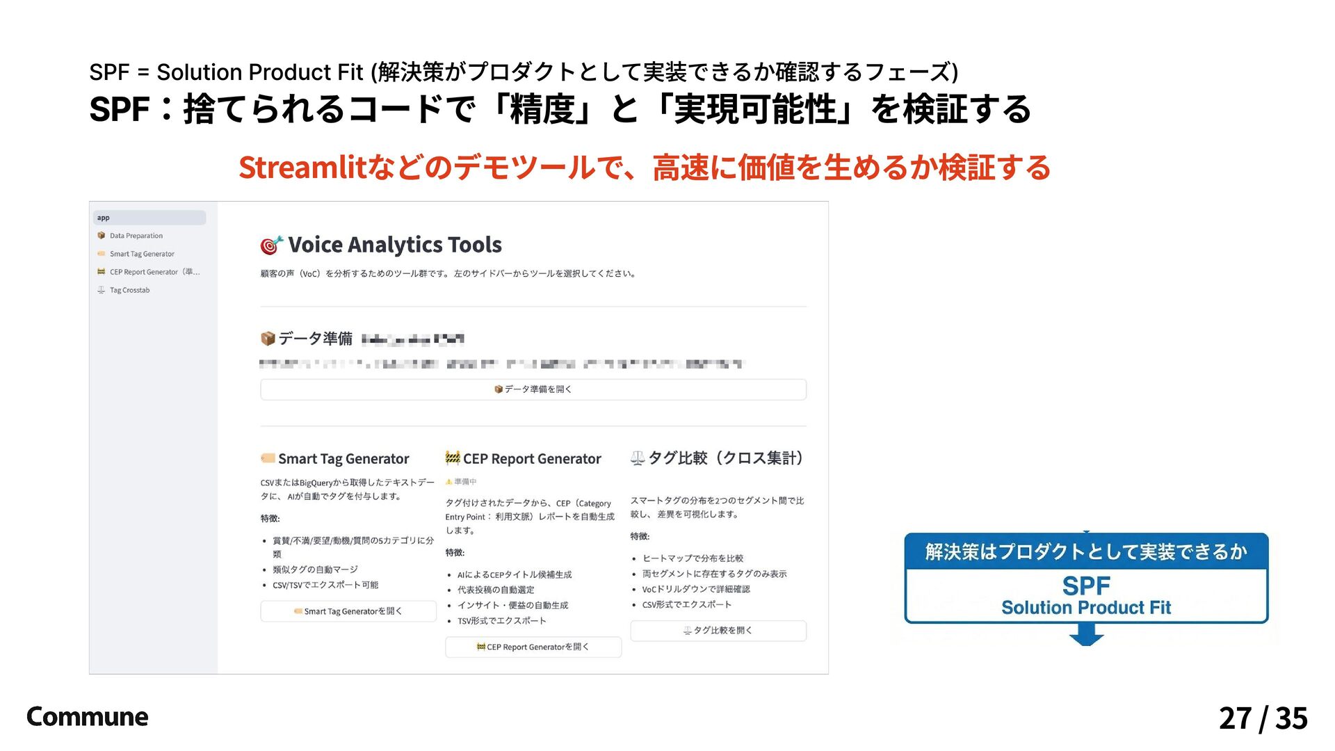 SPF:捨てられるコードで「精度」と「実現可能性」を検証する Streamlitなどのデモツールで、高速に価値を生めるか検証する SPF = Solution Product Fit (解決策がプロダクトとして実装できるか確認するフェーズ) 27 /