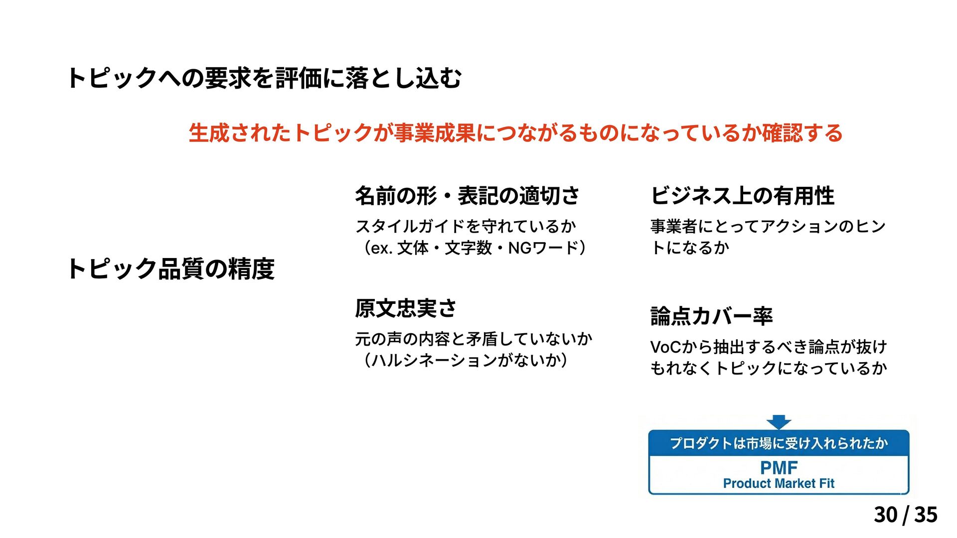 トになるか 論点カバー率 VoCから抽出するべき論点が抜け もれなくトピックになっているか トピックへの要求を評価に落とし込む 生成されたトピックが事業成果につながるものになっているか確認する 30 / 35