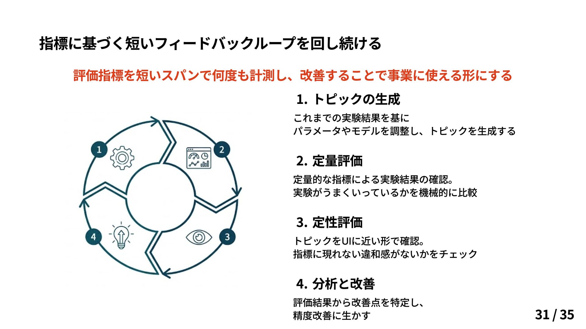 評価結果から改善点を特定し、 精度改善に生かす 指標に基づく短いフィードバックループを回し続ける 評価指標を短いスパンで何度も計測し、改善することで事業に使える形にする 31 / 35
