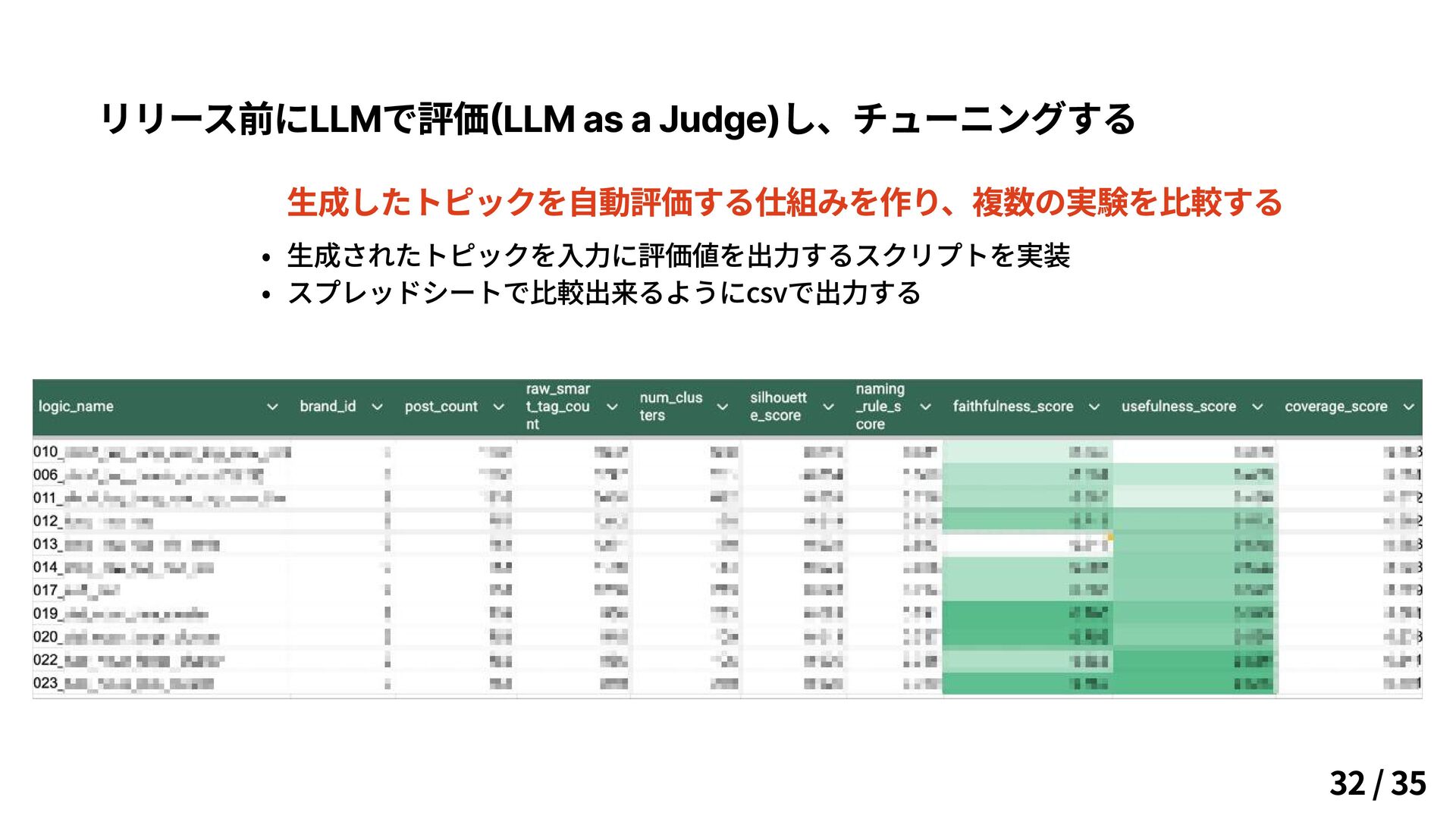 リリース前にLLMで評価(LLM as a Judge)し、チューニングする 生成したトピックを自動評価する仕組みを作り、複数の実験を比較する 生成されたトピックを入力に評価値を出力するスクリプトを実装 スプレッドシートで比較出来るようにcsvで出力する 32 / 35