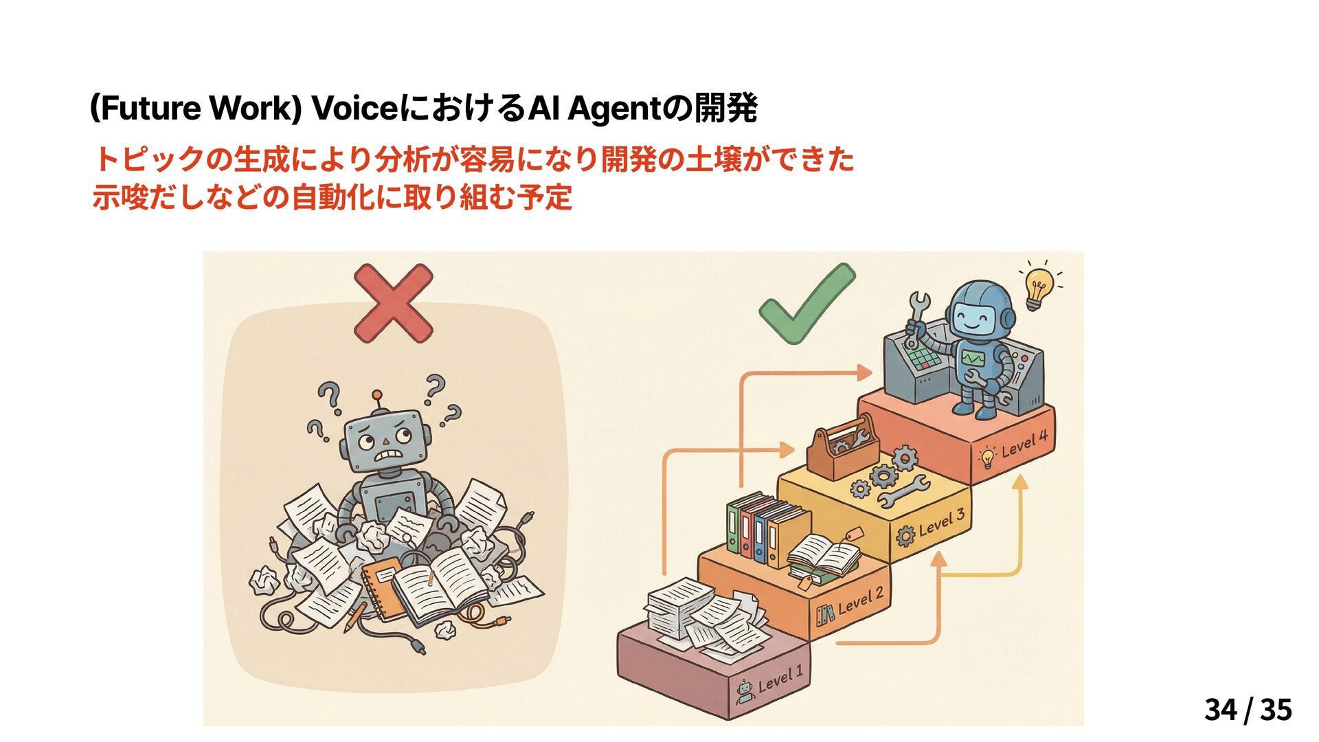 (Future Work) VoiceにおけるAI Agentの開発 トピックの生成により分析が容易になり開発の土壌ができた 示唆だしなどの自動化に取り組む予定 34 / 35