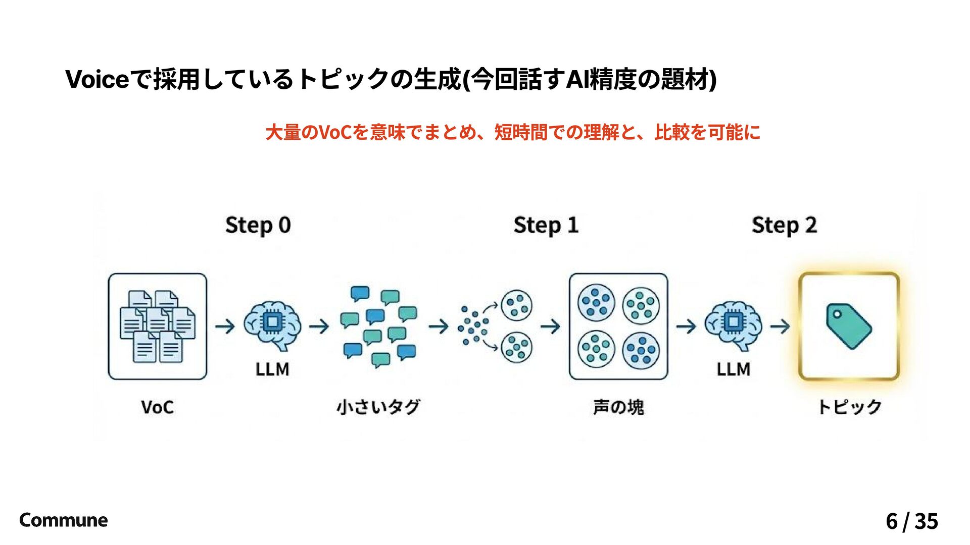 Voiceで採用しているトピックの生成(今回話すAI精度の題材) 大量のVoCを意味でまとめ、短時間での理解と、比較を可能に 6 / 35