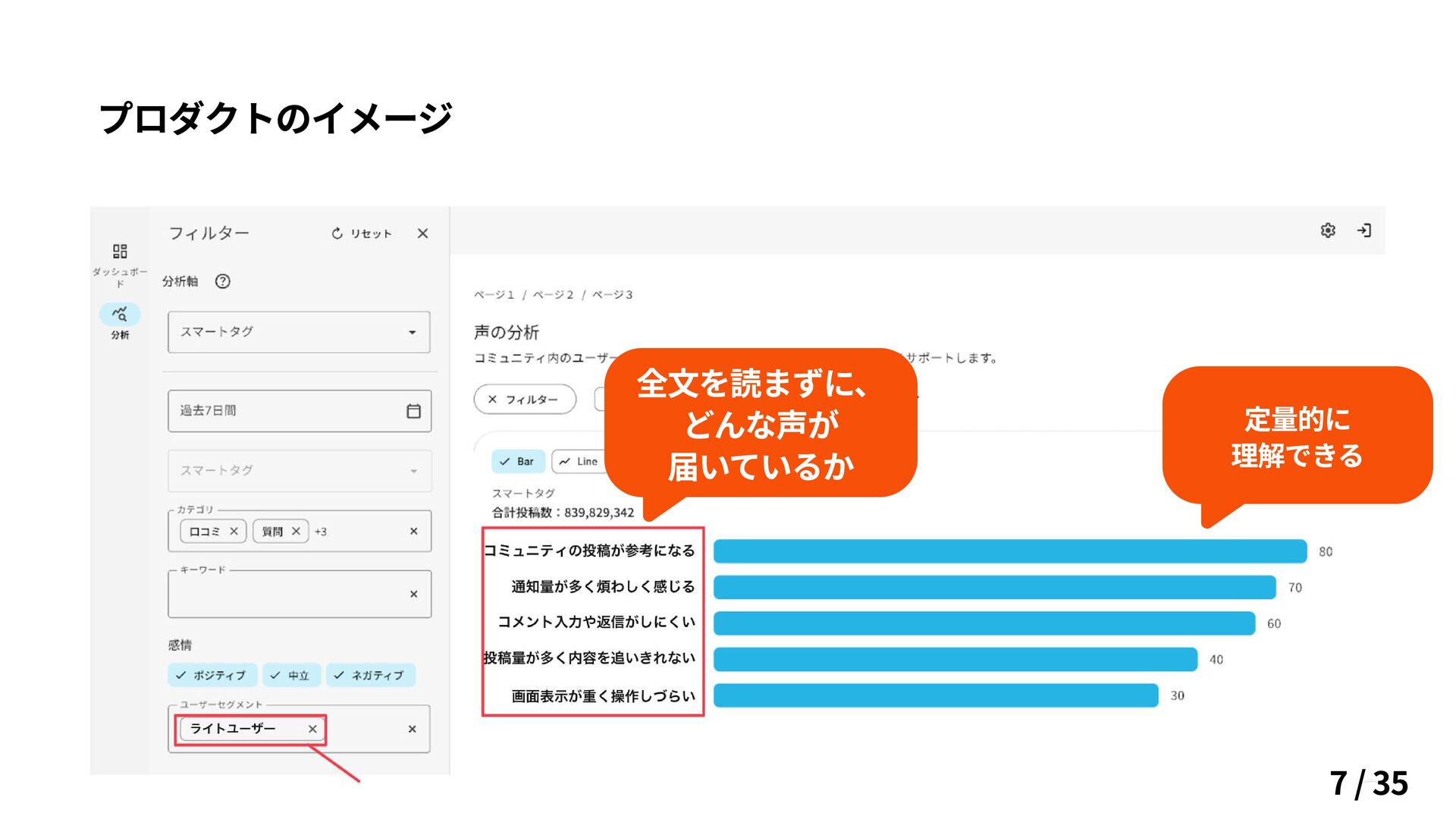 プロダクトのイメージ 全文を読まずに、 どんな声が 届いているか 定量的に 理解できる 7 / 35