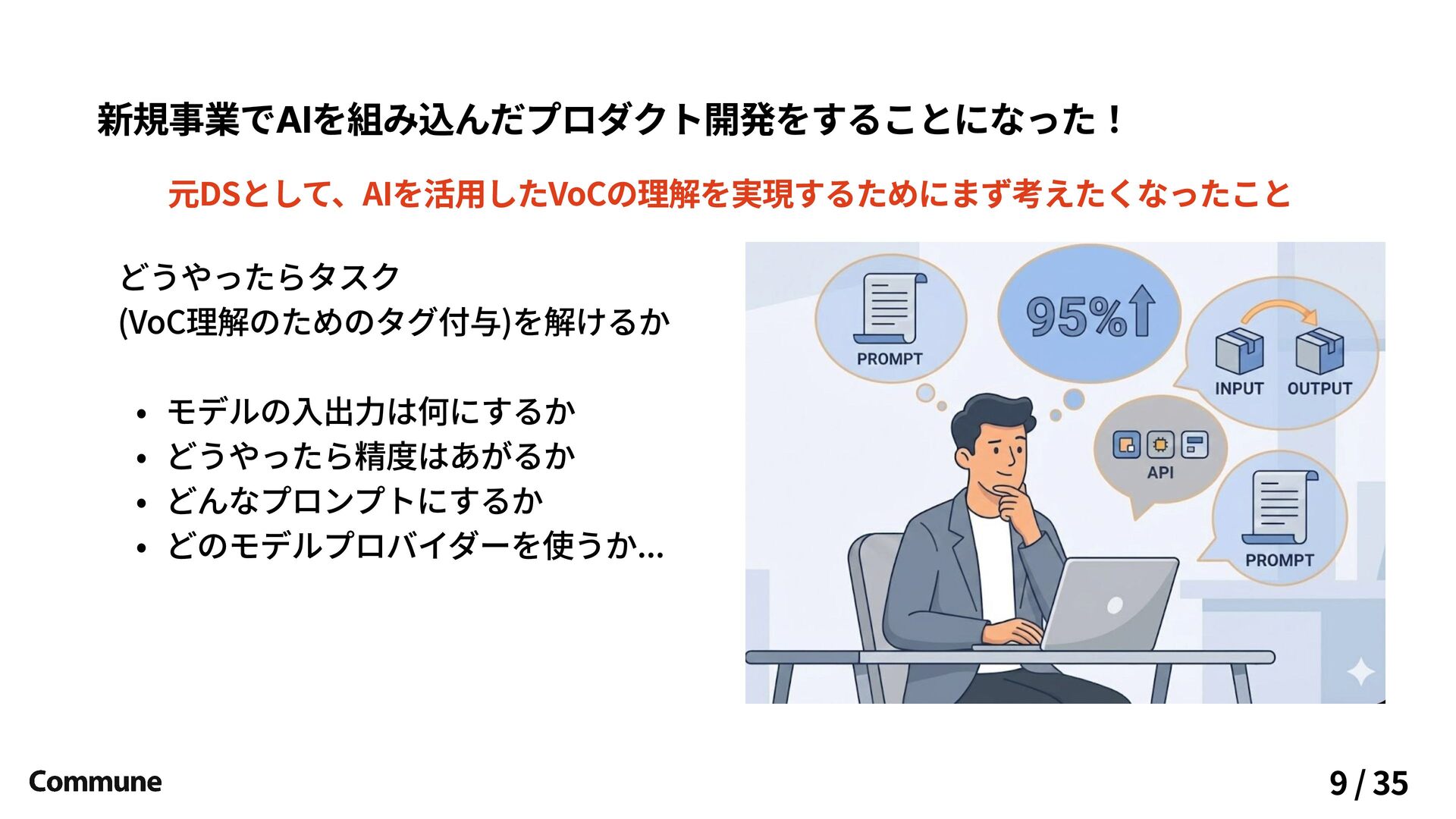 新規事業でAIを組み込んだプロダクト開発をすることになった! 元DSとして、AIを活用したVoCの理解を実現するためにまず考えたくなったこと どうやったらタスク (VoC理解のためのタグ付与)を解けるか モデルの入出力は何にするか どうやったら精度はあがるか どんなプロンプトにするか どのモデルプロバイダーを使うか... 9 /