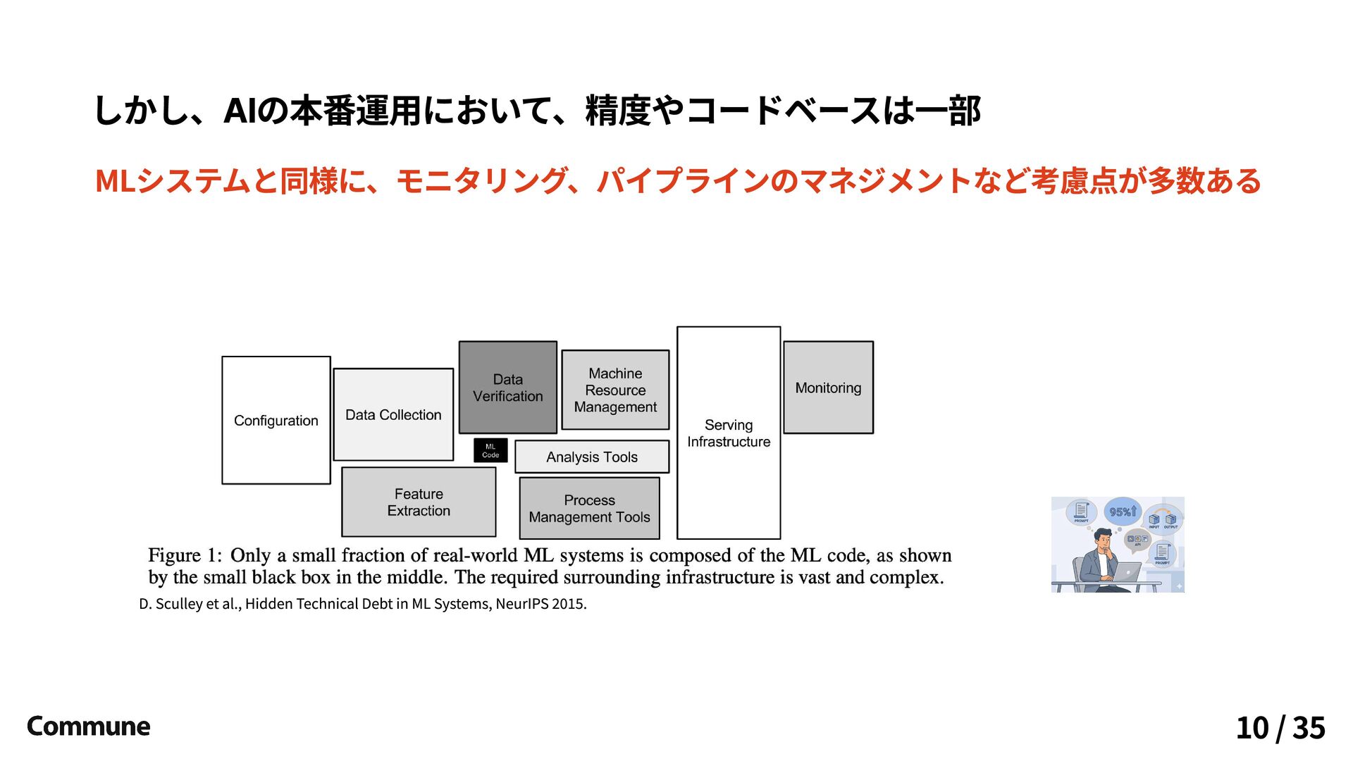 しかし、AIの本番運用において、精度やコードベースは一部 MLシステムと同様に、モニタリング、パイプラインのマネジメントなど考慮点が多数ある 10 / 35 D. Sculley et al., Hidden