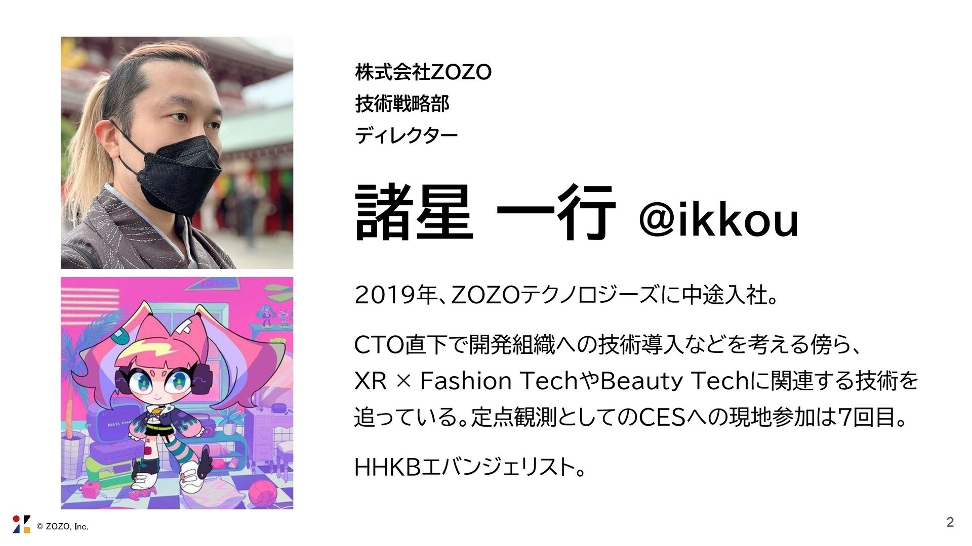 2. © ZOZO, Inc. 株式会社ZOZO 技術戦略部 ディレクター 諸星 一行 @ikkou 2019年、ZOZOテクノロジーズに中途入社。