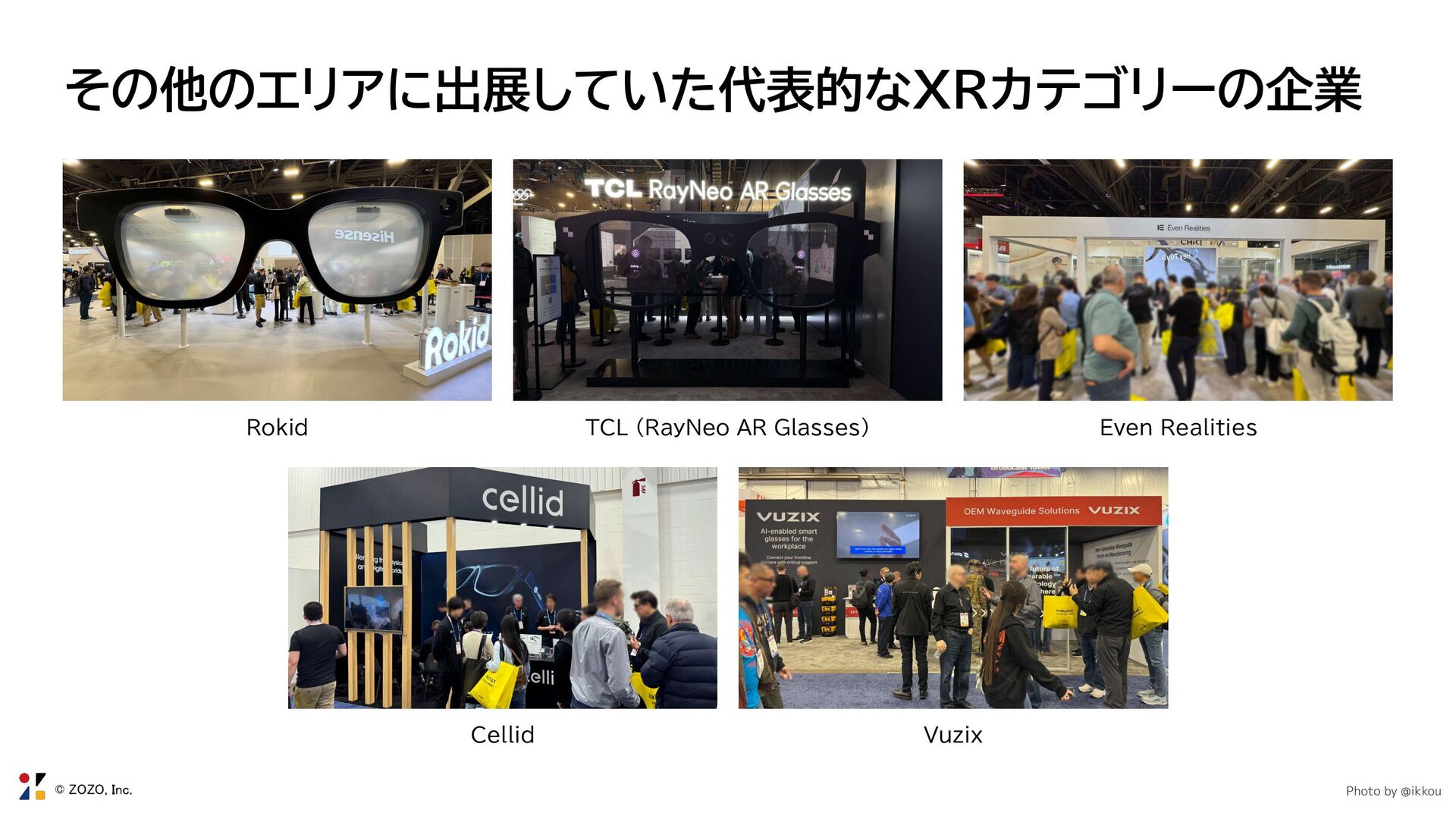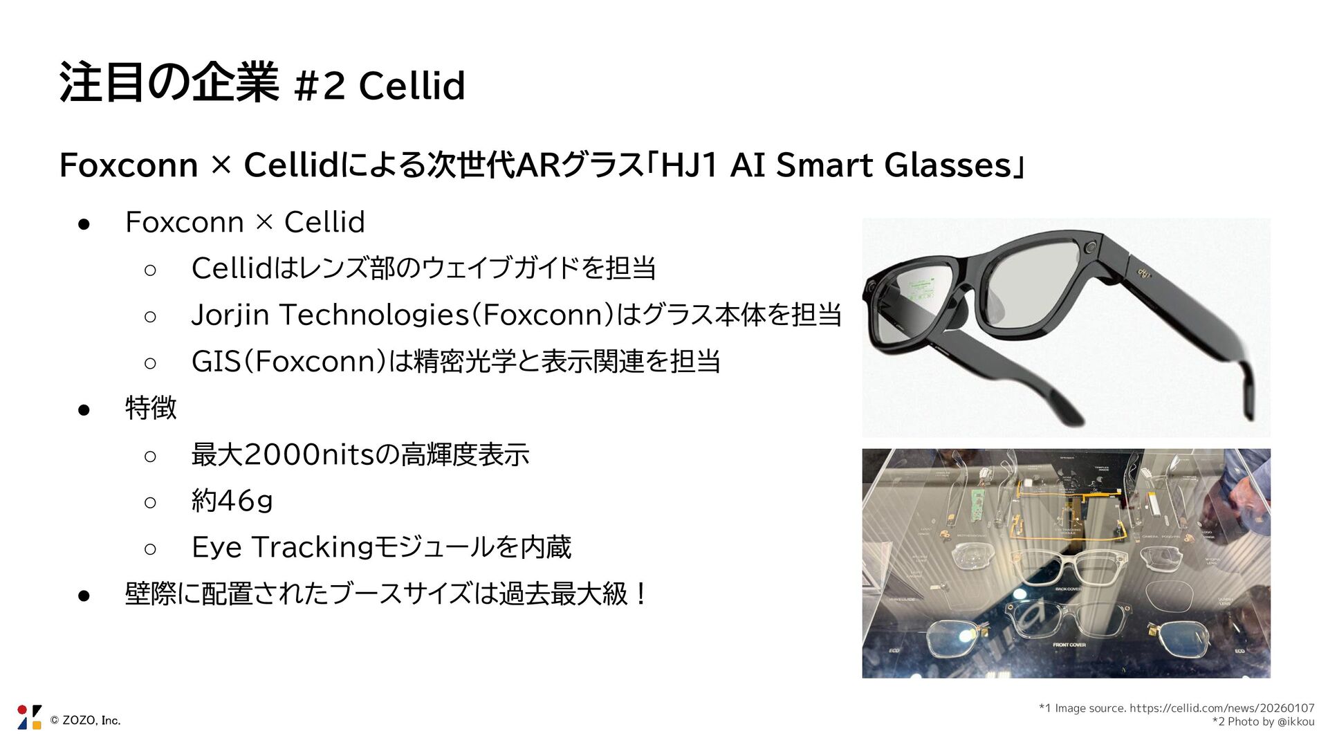 Smart Glasses」 • Foxconn × Cellid ◦ Cellidはレンズ部のウェイブガイドを担当 ◦ Jorjin Technologies(Foxconn)はグラス本体を担当 ◦ GIS(Foxconn)は精密光学と表示関連を担当 • 特徴 ◦ 最大2000nitsの高輝度表示 ◦ 約46g ◦ Eye Trackingモジュールを内蔵 • 壁際に配置されたブースサイズは過去最大級! *1 Image source. https://cellid.com/news/20260107 *2 Photo by @ikkou