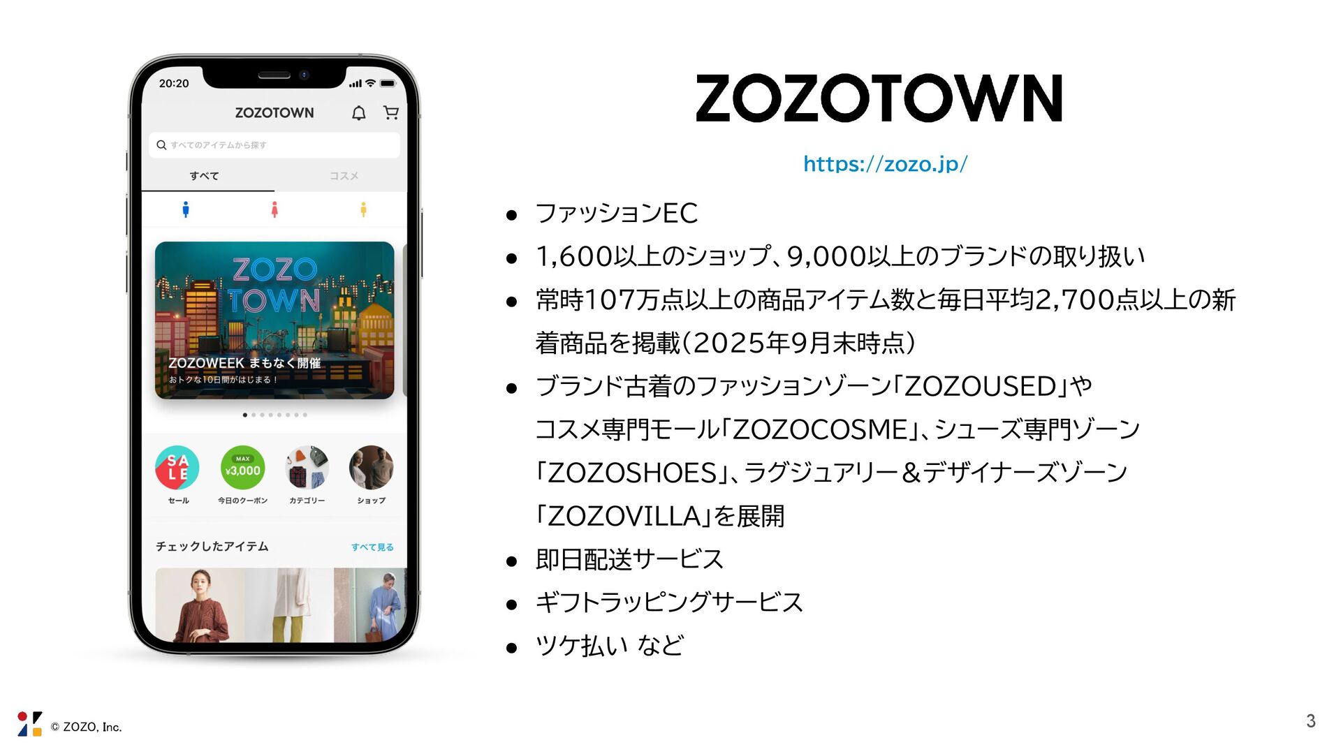 常時107万点以上の商品アイテム数と毎日平均2,700点以上の新 着商品を掲載(2025年9月末時点) • ブランド古着のファッションゾーン「ZOZOUSED」や コスメ専門モール「ZOZOCOSME」、シューズ専門ゾーン 「ZOZOSHOES」、ラグジュアリー&デザイナーズゾーン 「ZOZOVILLA」を展開 • 即日配送サービス • ギフトラッピングサービス • ツケ払い など