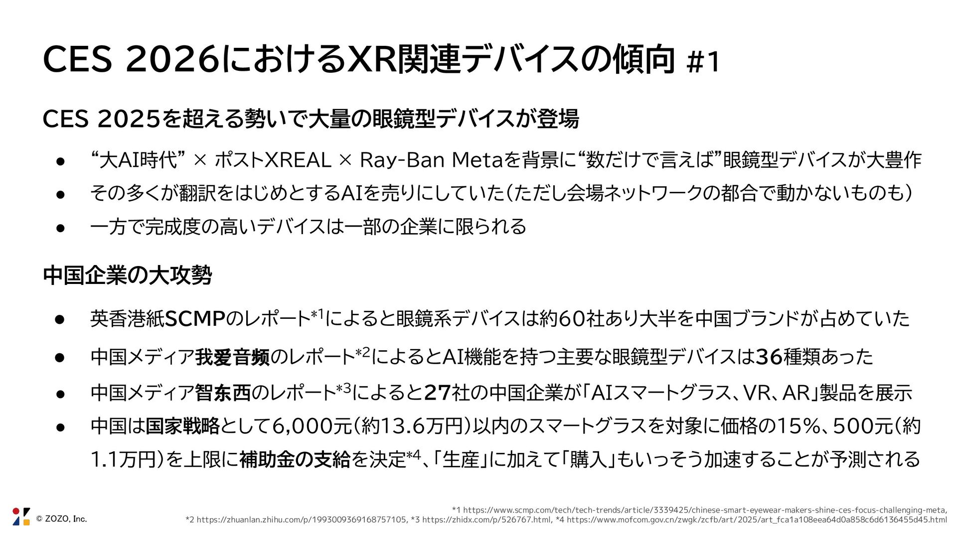 × ポストXREAL × Ray-Ban Metaを背景に“数だけで言えば”眼鏡型デバイスが大豊作 • その多くが翻訳をはじめとするAIを売りにしていた(ただし会場ネットワークの都合で動かないものも) • 一方で完成度の高いデバイスは一部の企業に限られる 中国企業の大攻勢 • 英香港紙SCMPのレポート*1によると眼鏡系デバイスは約60社あり大半を中国ブランドが占めていた • 中国メディア我爱音频のレポート*2によるとAI機能を持つ主要な眼鏡型デバイスは36種類あった • 中国メディア智东西のレポート*3によると27社の中国企業が「AIスマートグラス、VR、AR」製品を展示 • 中国は国家戦略として6,000元(約13.6万円)以内のスマートグラスを対象に価格の15%、500元(約 1.1万円)を上限に補助金の支給を決定*4、「生産」に加えて「購入」もいっそう加速することが予測される *1 https://www.scmp.com/tech/tech-trends/article/3339425/chinese-smart-eyewear-makers-shine-ces-focus-challenging-meta, *2 https://zhuanlan.zhihu.com/p/1993009369168757105, *3 https://zhidx.com/p/526767.html, *4 https://www.mofcom.gov.cn/zwgk/zcfb/art/2025/art_fca1a108eea64d0a858c6d6136455d45.html