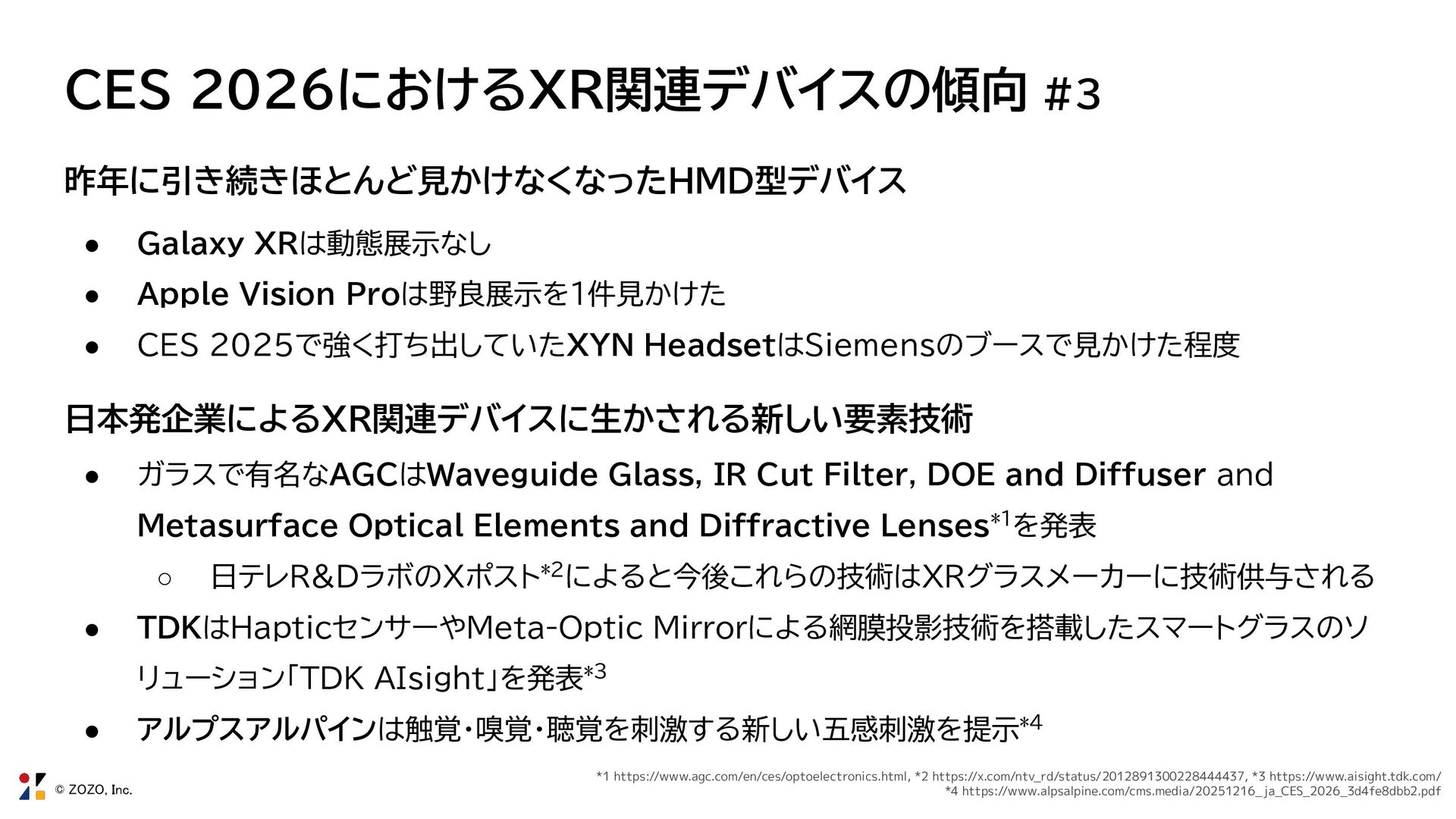 • Apple Vision Proは野良展示を1件見かけた • CES 2025で強く打ち出していたXYN HeadsetはSiemensのブースで見かけた程度 日本発企業によるXR関連デバイスに生かされる新しい要素技術 • ガラスで有名なAGCはWaveguide Glass, IR Cut Filter, DOE and Diffuser and Metasurface Optical Elements and Diffractive Lenses*1を発表 ◦ 日テレR&DラボのXポスト*2によると今後これらの技術はXRグラスメーカーに技術供与される • TDKはHapticセンサーやMeta-Optic Mirrorによる網膜投影技術を搭載したスマートグラスのソ リューション「TDK AIsight」を発表*3 • アルプスアルパインは触覚・嗅覚・聴覚を刺激する新しい五感刺激を提示*4 *1 https://www.agc.com/en/ces/optoelectronics.html, *2 https://x.com/ntv_rd/status/2012891300228444437, *3 https://www.aisight.tdk.com/ *4 https://www.alpsalpine.com/cms.media/20251216_ja_CES_2026_3d4fe8dbb2.pdf