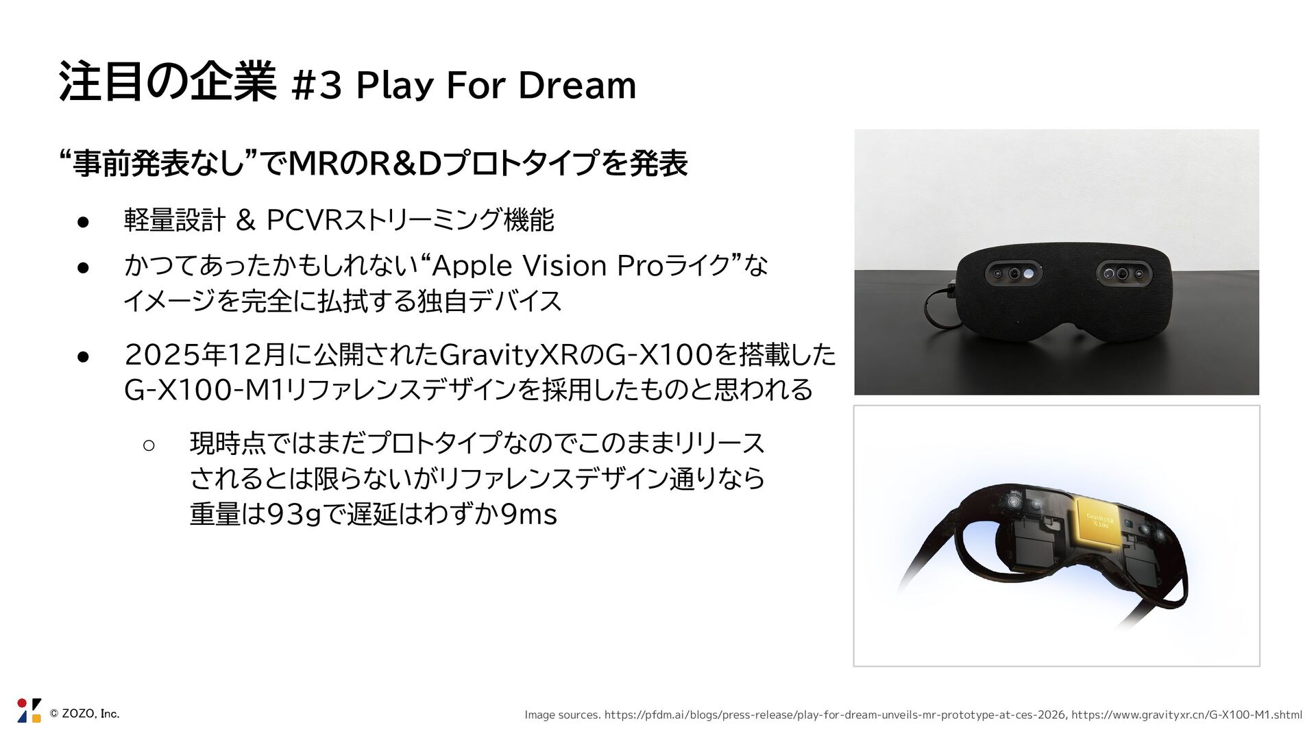 軽量設計 & PCVRストリーミング機能 • かつてあったかもしれない“Apple Vision Proライク”な イメージを完全に払拭する独自デバイス • 2025年12月に公開されたGravityXRのG-X100を搭載した G-X100-M1リファレンスデザインを採用したものと思われる ◦ 現時点ではまだプロトタイプなのでこのままリリース されるとは限らないがリファレンスデザイン通りなら 重量は93gで遅延はわずか9ms Image sources. https://pfdm.ai/blogs/press-release/play-for-dream-unveils-mr-prototype-at-ces-2026, https://www.gravityxr.cn/G-X100-M1.shtml