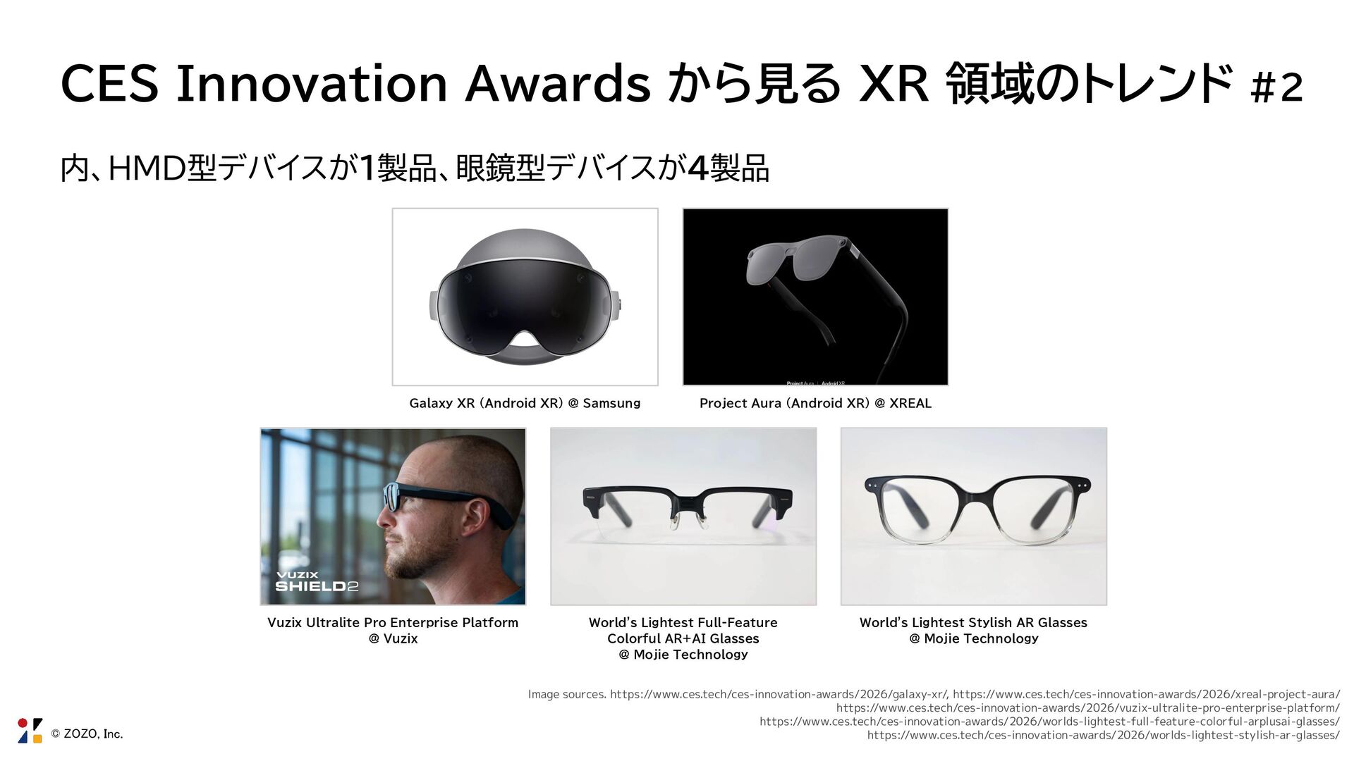 内、HMD型デバイスが1製品、眼鏡型デバイスが4製品 Galaxy XR (Android XR) @ Samsung Project Aura (Android XR) @ XREAL Vuzix Ultralite Pro Enterprise Platform @ Vuzix World's Lightest Full-Feature Colorful AR+AI Glasses @ Mojie Technology World's Lightest Stylish AR Glasses @ Mojie Technology Image sources. https://www.ces.tech/ces-innovation-awards/2026/galaxy-xr/, https://www.ces.tech/ces-innovation-awards/2026/xreal-project-aura/ https://www.ces.tech/ces-innovation-awards/2026/vuzix-ultralite-pro-enterprise-platform/ https://www.ces.tech/ces-innovation-awards/2026/worlds-lightest-full-feature-colorful-arplusai-glasses/ https://www.ces.tech/ces-innovation-awards/2026/worlds-lightest-stylish-ar-glasses/