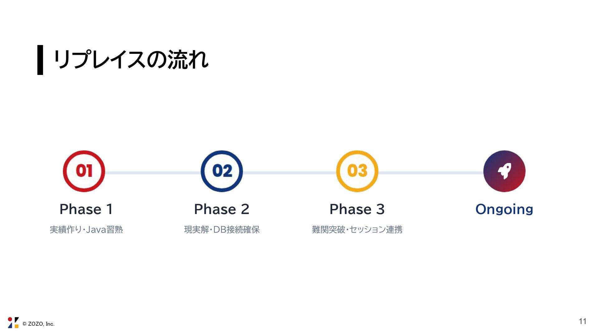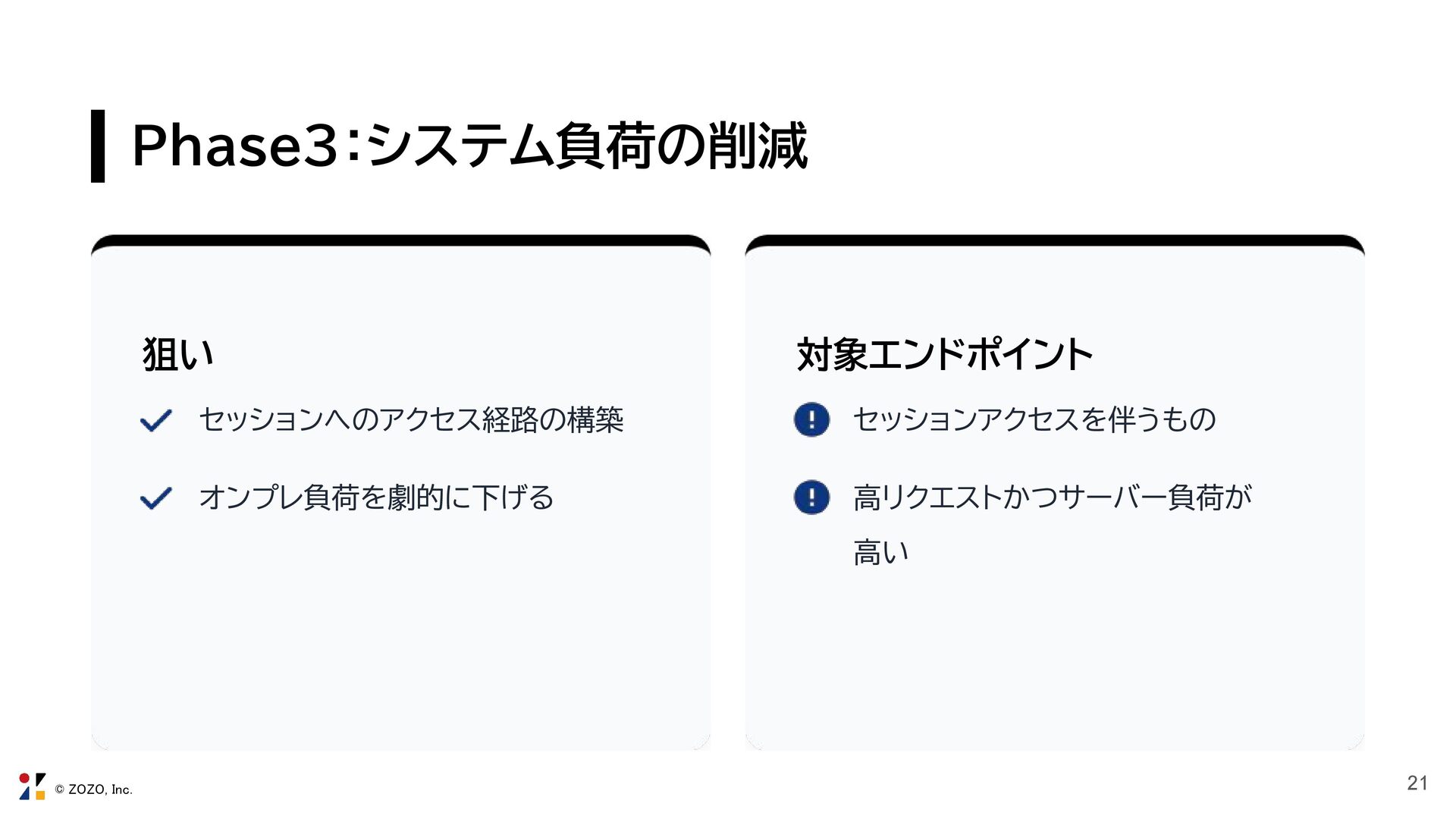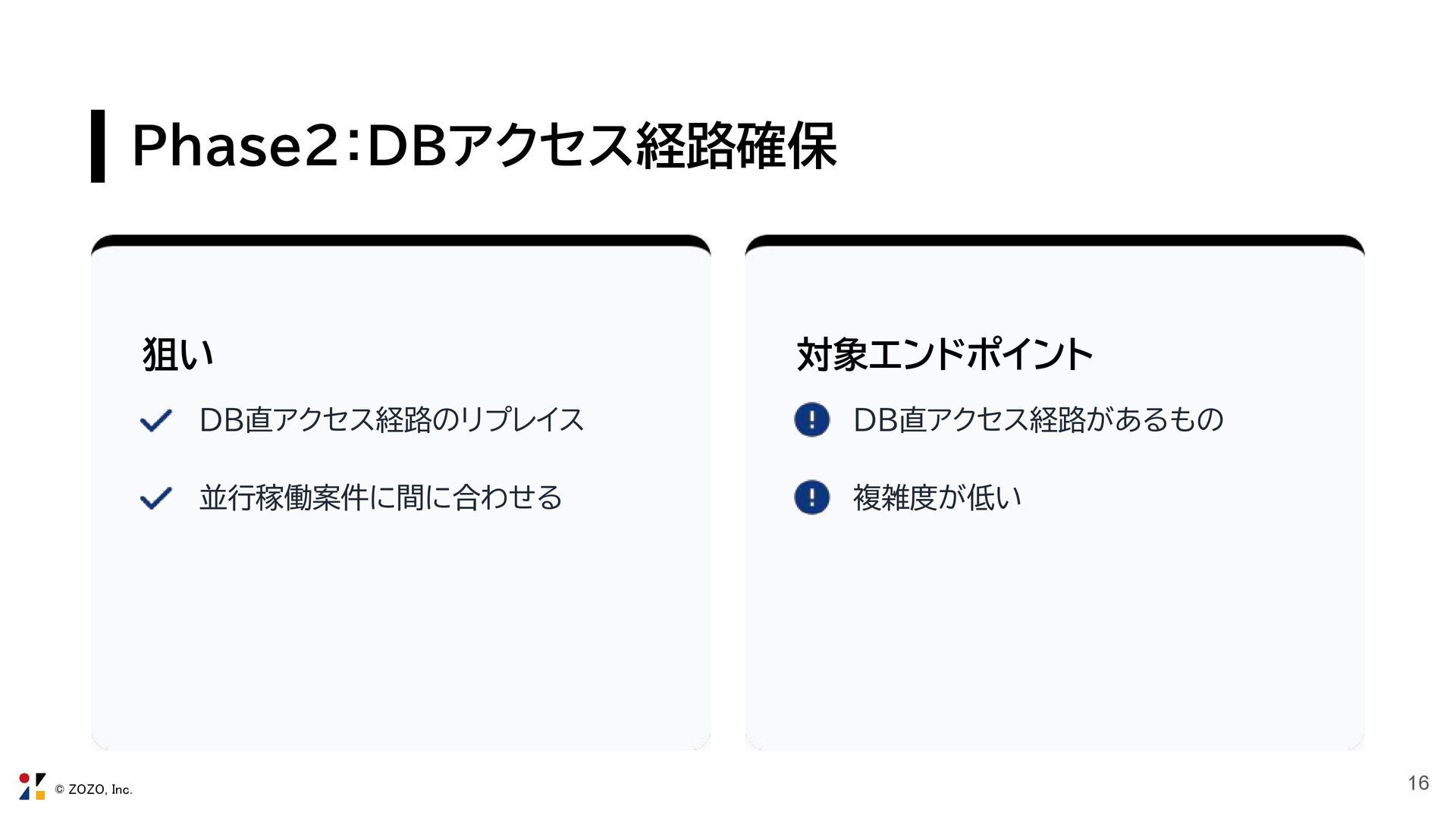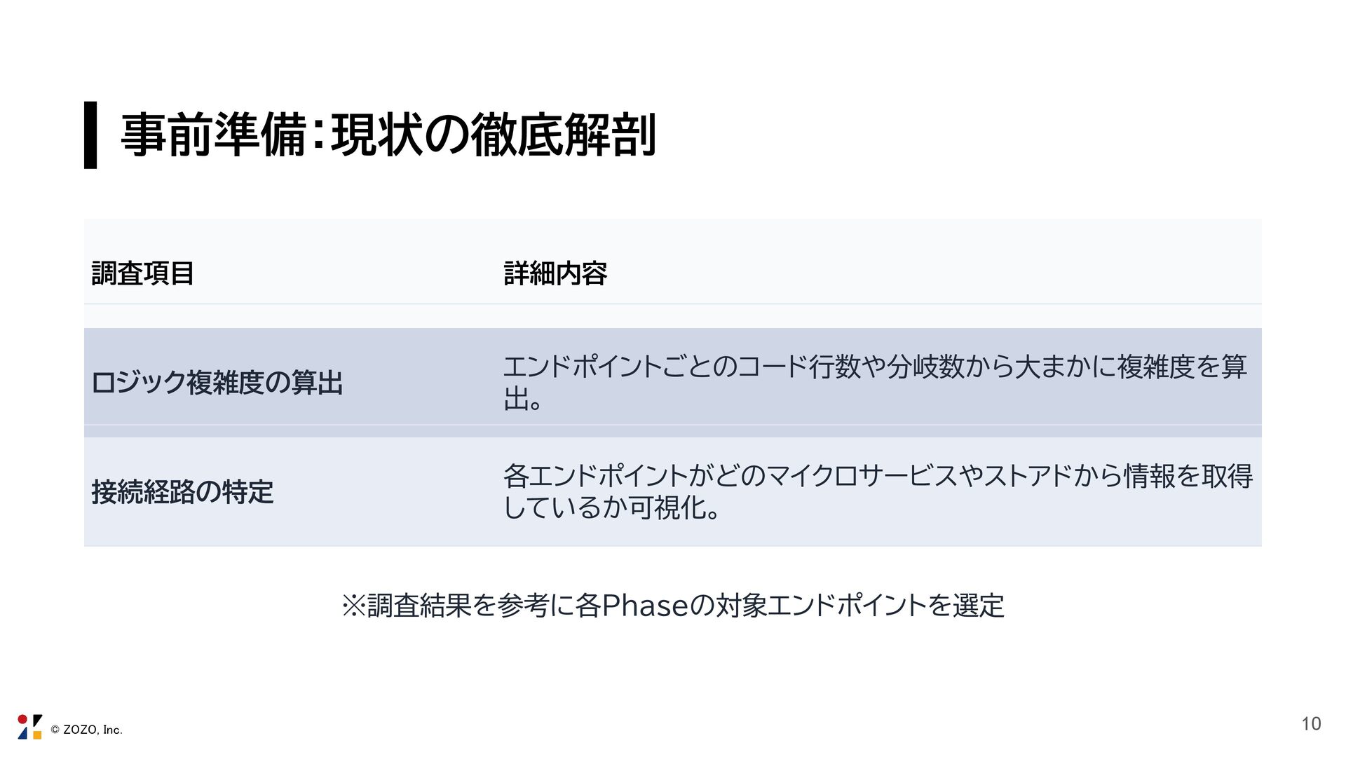 2. © ZOZO, Inc. 10 ※調査結果を参考に各Phaseの対象エンドポイントを選定 調査項目 詳細内容 ロジック複雑度の算出 エンドポイントごとのコード行数や分岐数から大まかに複雑度を算 出。