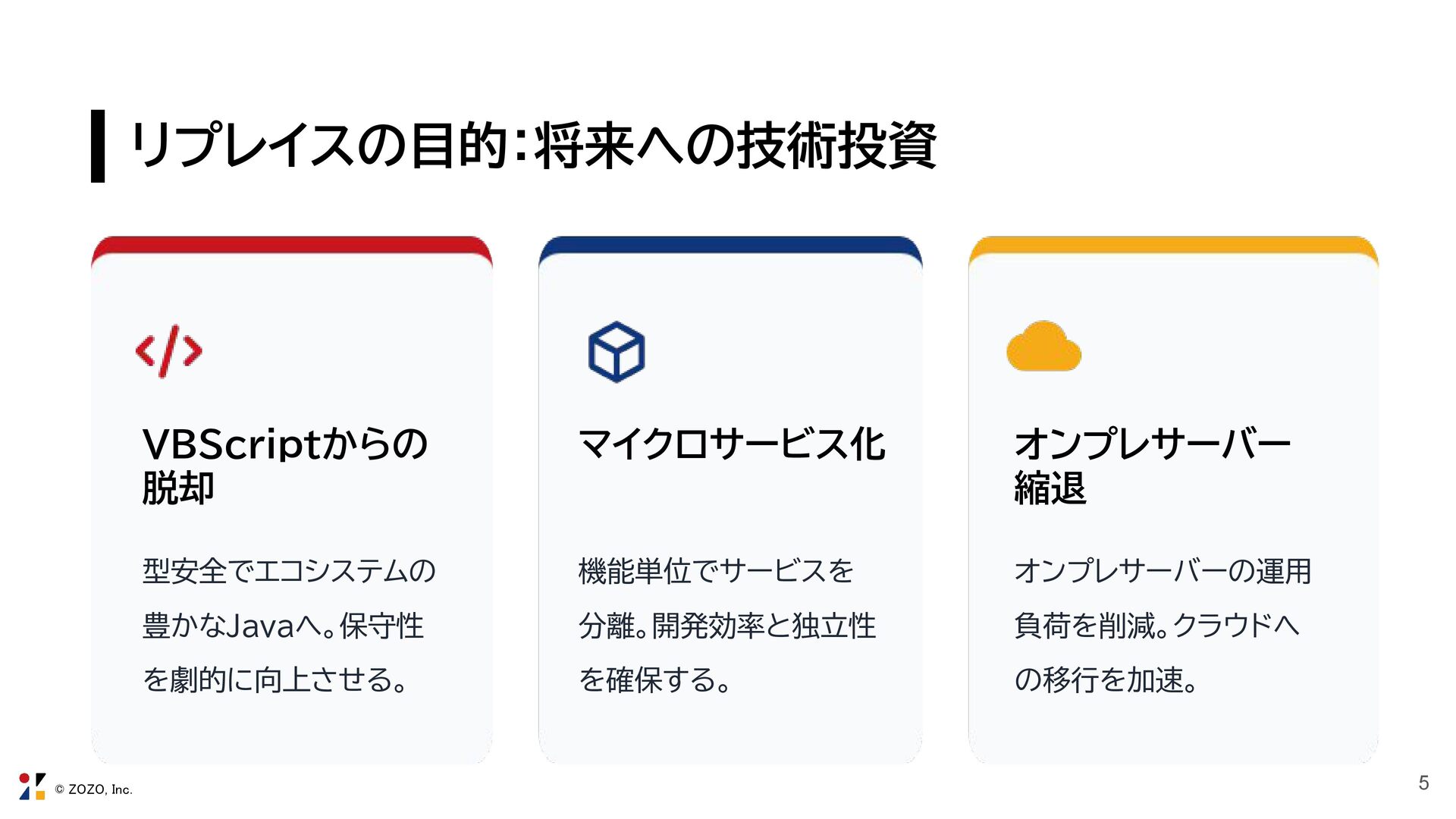 1. © ZOZO, Inc. 5 VBScriptからの 脱却 型安全でエコシステムの 豊かなJavaへ。保守性 を劇的に向上させる。 マイクロサービス化