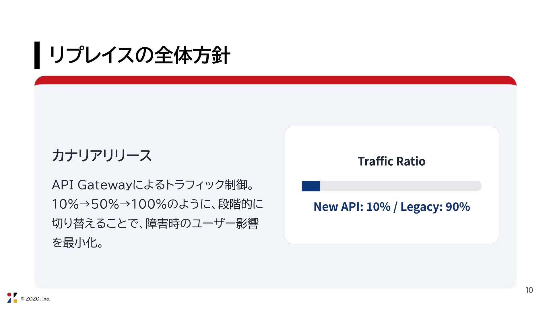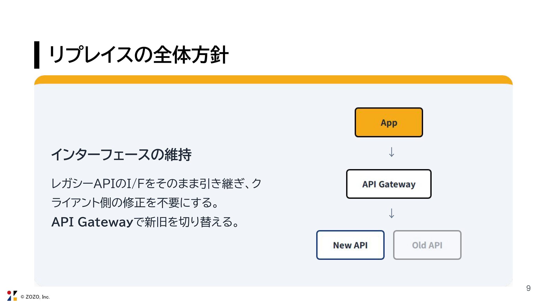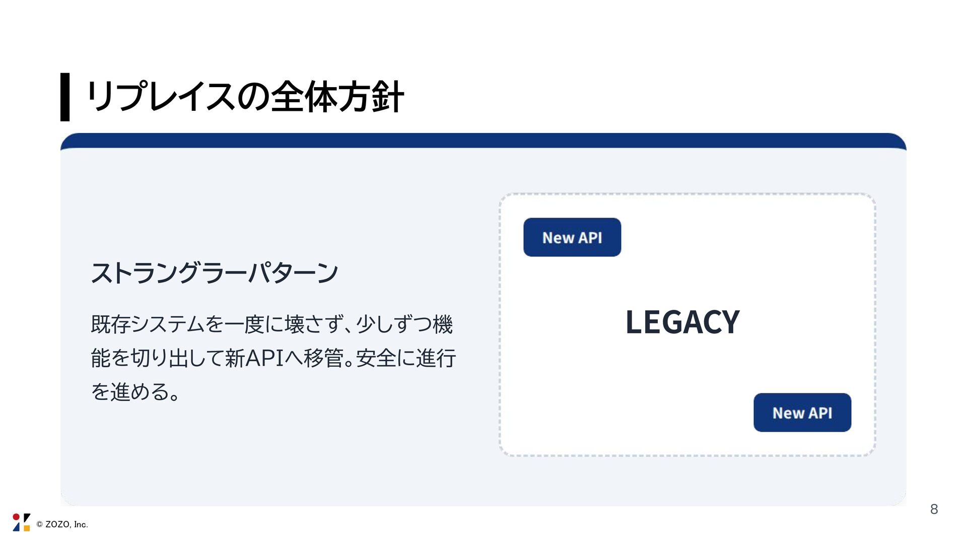 機能単位でサービスを 分離。開発効率と独立性 を確保する。 オンプレサーバー 縮退 オンプレサーバーの運用 負荷を削減。クラウドへ の移行を加速。 リプレイスの目的:将来への技術投資
