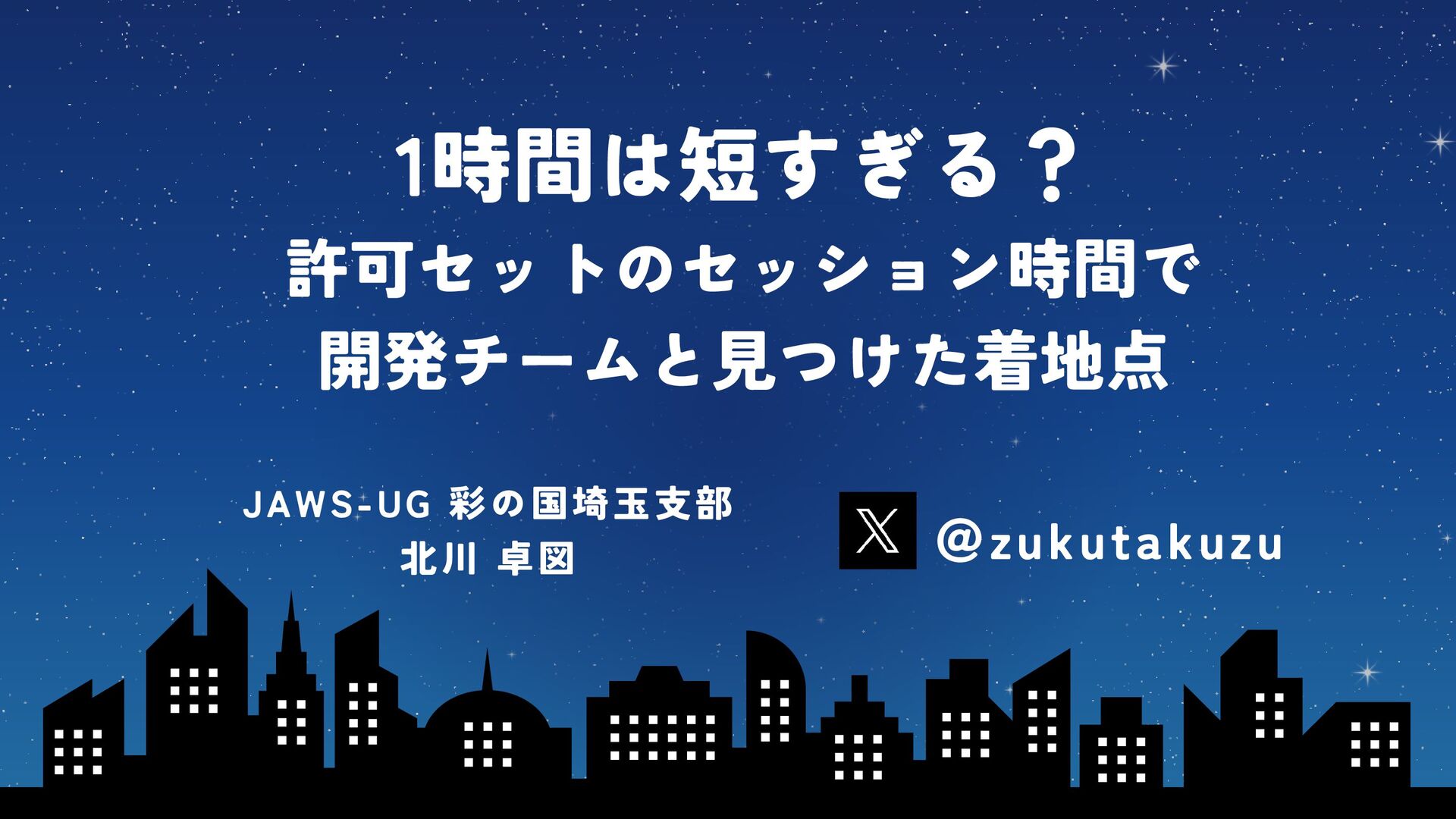 1時間は短すぎる? 許可セットのセッション時間で 開発チームと見つけた着地点 JAWS-UG 彩の国埼玉支部 北川 卓図 @zukutakuzu