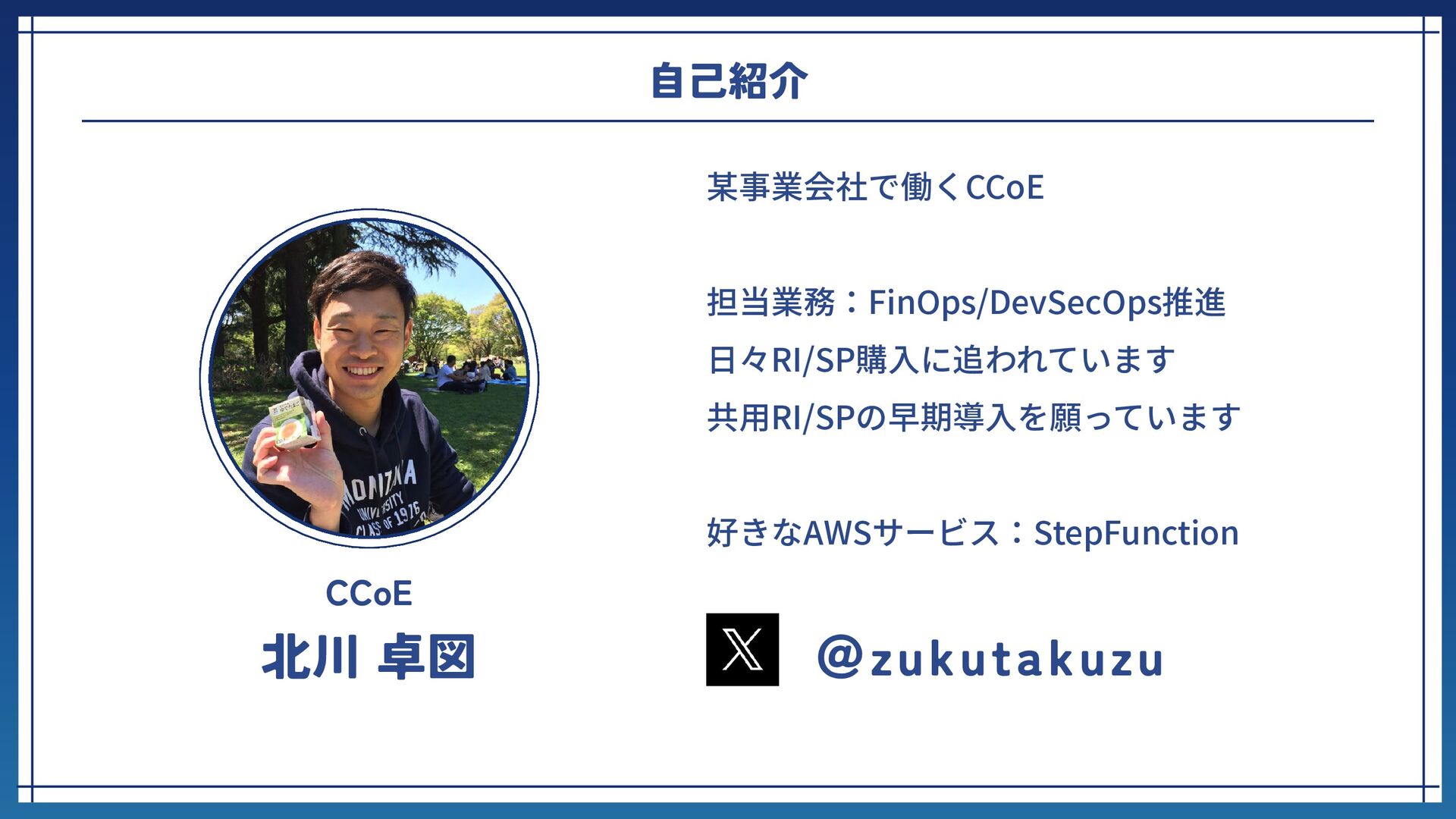 自己紹介 北川 卓図 CCoE 某事業会社で働くCCoE 担当業務:FinOps/DevSecOps推進 日々RI/SP購入に追われています 共用RI/SPの早期導入を願っています 好きなAWSサービス:StepFunction @zukutakuzu