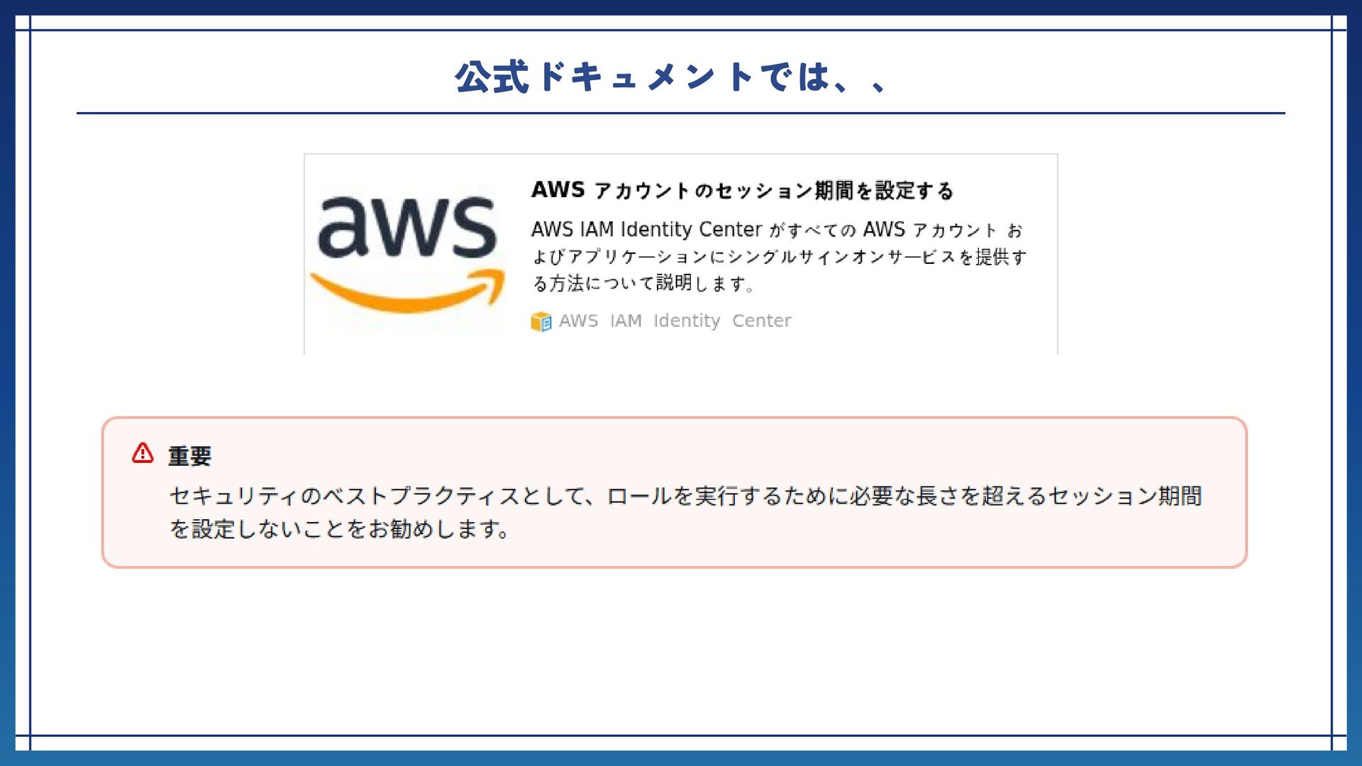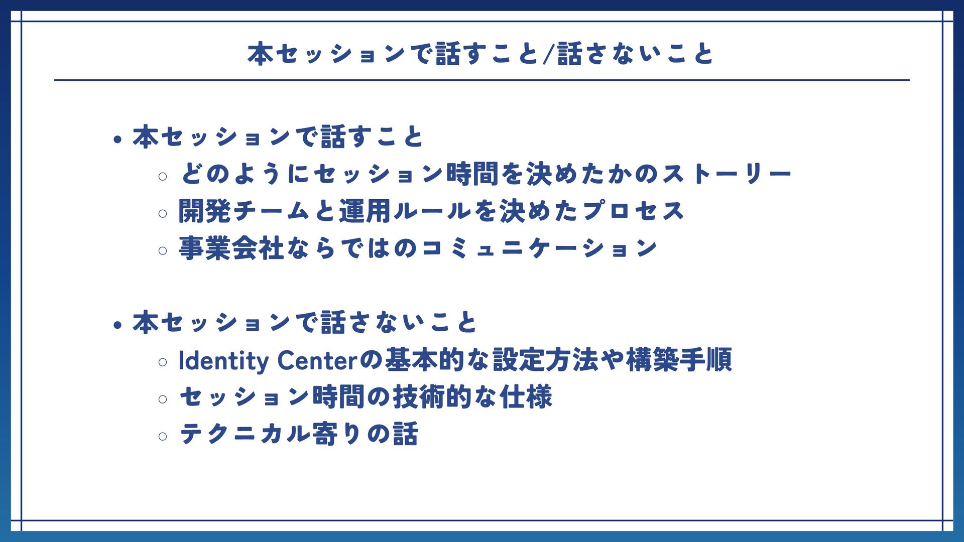 本セッションで話すこと/話さないこと 本セッションで話すこと どのようにセッション時間を決めたかのストーリー 開発チームと運用ルールを決めたプロセス 事業会社ならではのコミュニケーション 本セッションで話さないこと Identity Centerの基本的な設定方法や構築手順 セッション時間の技術的な仕様 テクニカル寄りの話