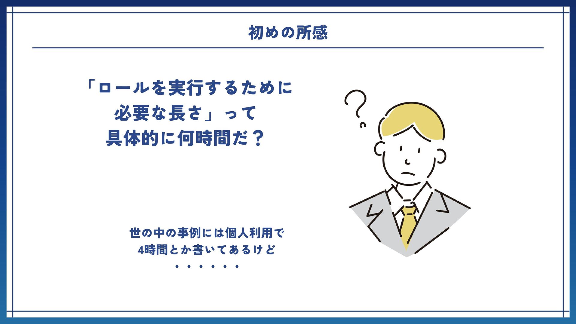 「ロールを実行するために 必要な長さ」って 具体的に何時間だ? 初めの所感 世の中の事例には個人利用で 4時間とか書いてあるけど ・・・・・・