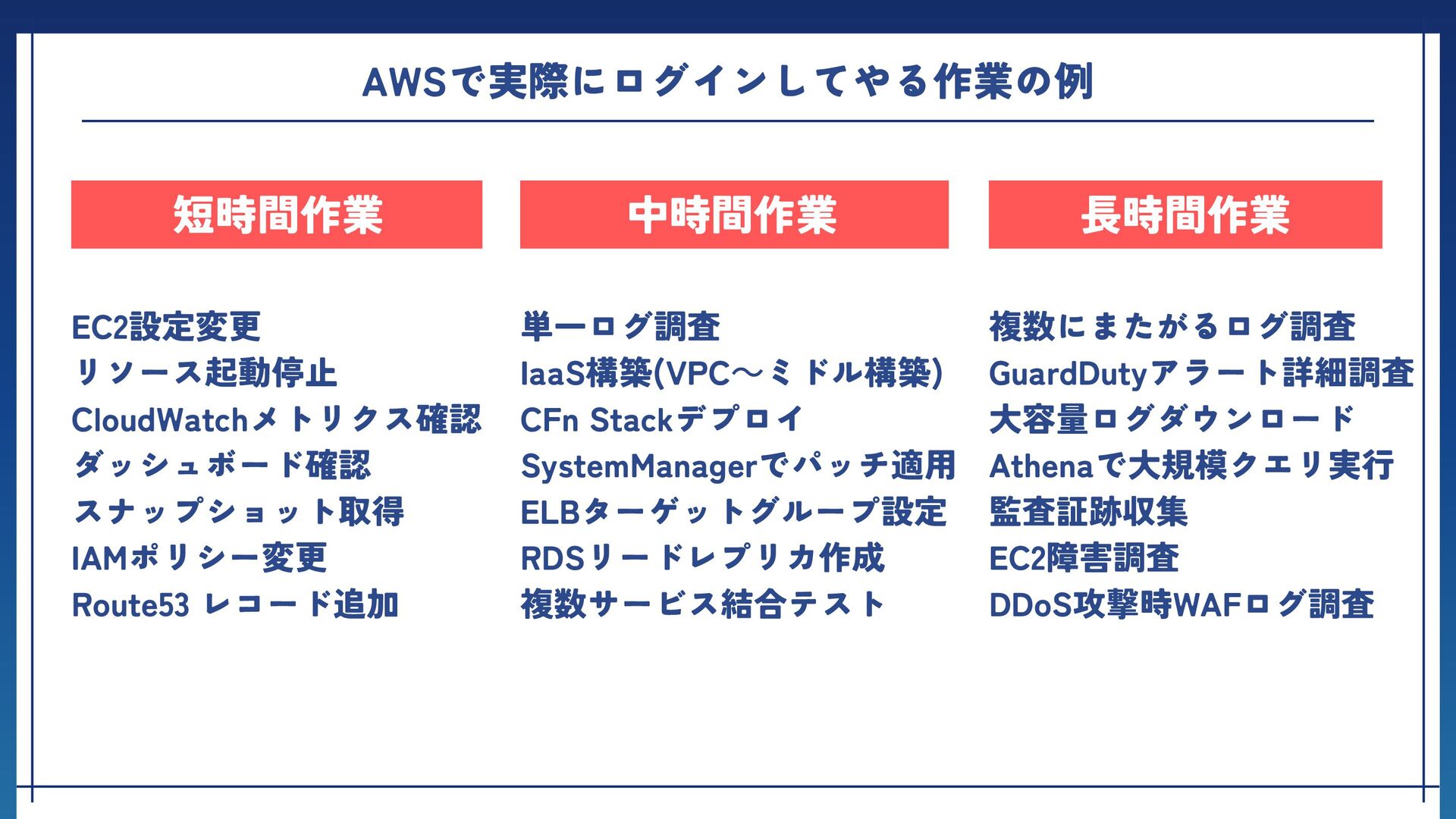 中時間作業 長時間作業 単一ログ調査 IaaS構築(VPC ~ミドル構築) CFn Stackデプロイ SystemManagerでパッチ適用 ELBターゲットグループ設定 RDSリードレプリカ作成 複数サービス結合テスト 複数にまたがるログ調査 GuardDutyアラート詳細調査 大容量ログダウンロード Athenaで大規模クエリ実行 監査証跡収集 EC2障害調査 DDoS攻撃時WAFログ調査