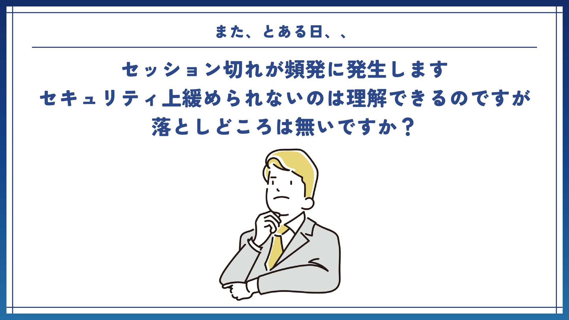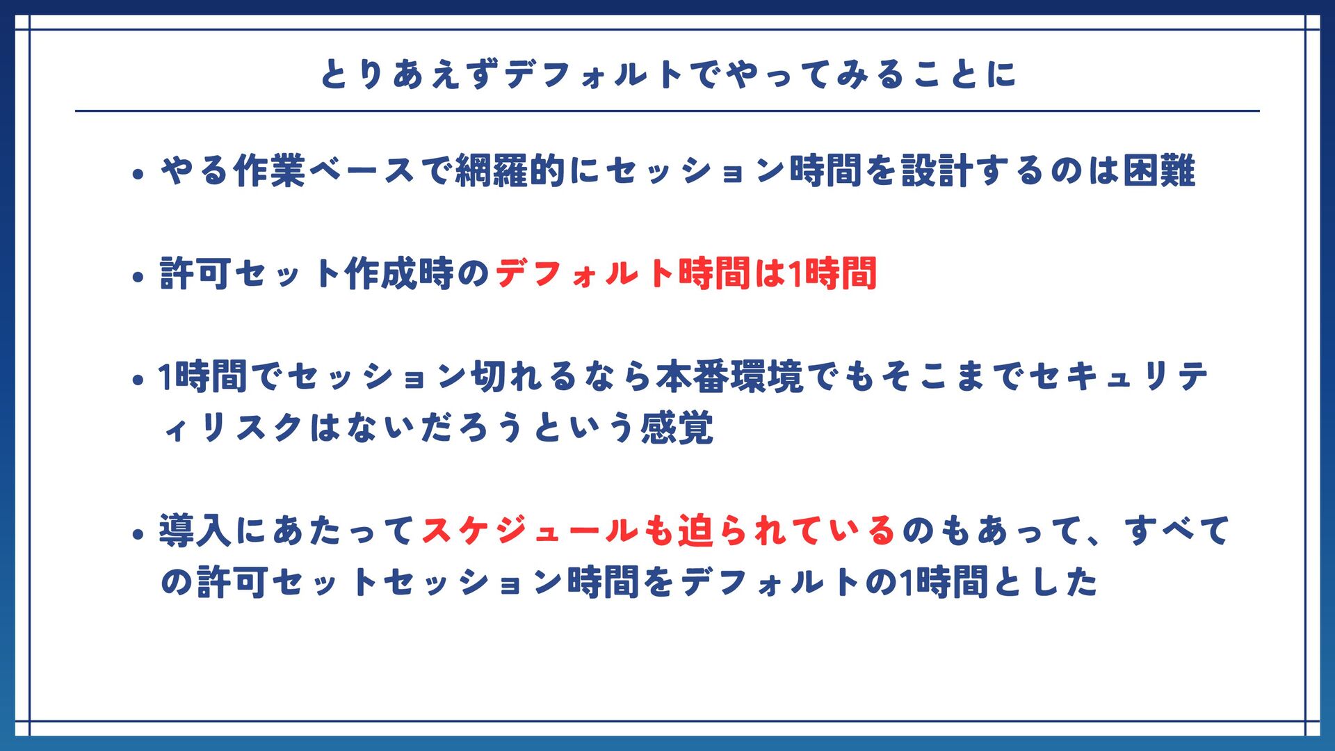 1時間でセッション切れるなら本番環境でもそこまでセキュリテ ィリスクはないだろうという感覚 導入にあたってスケジュールも迫られているのもあって、すべて の許可セットセッション時間をデフォルトの1時間とした