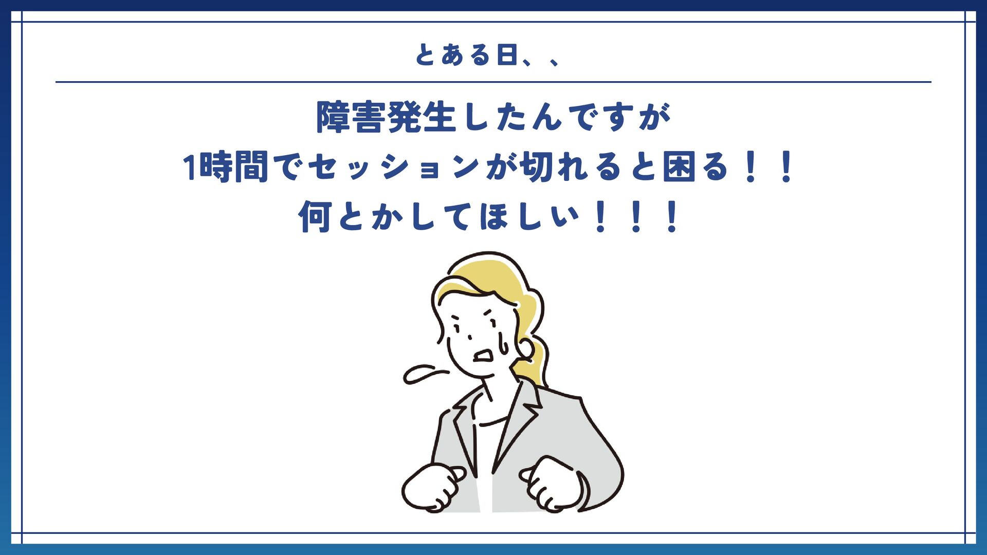 短時間作業 長時間作業 具体的には障害時のどんな作業でセッション切れになりますか? 土日含む緊急対応の際にセッションが切れてしまいます 具体的にはCloudWatch Logs のクエリ実行、内容確認 Session Manager接続してEC2のログ確認 など 攻撃を受けた際は一刻も早く解明が必要です